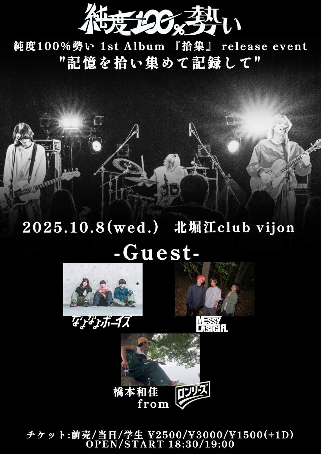 北堀江 club vijon(クラブビジョン) スケジュール 2025.10.08(Wed) 純度100%勢いpresents. 1st album 拾集 release event"記憶を拾い集めて記録して"〜東名名阪阪阪〜 [ACT] 純度100%勢い / なよなよボーイズ / Messy last girl / 橋本和佳 [OPEN/START] 17:30 / 18:00 [料金] 一般¥2,500 当日¥3,000 学生¥1,500 それぞれ別途1drink¥700 (問)北堀江club vijon 06-6539-7411 info@vijon.jp 〒550-0014 大阪府大阪市西区北堀江1-22 マインズ北堀江B1