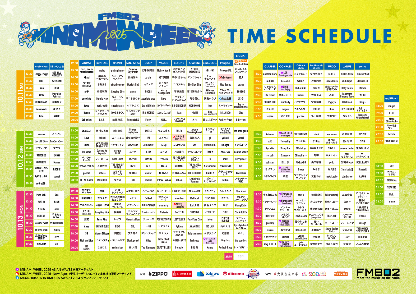 北堀江 club vijon(クラブビジョン) スケジュール 2025.10.11(Sat) FM802 MINAMI WHEEL 2025 [ACT] Groggy‐Froggy / OXU / Lenn / 是猫 / 浜野はるき / Rons week / Lilin [OPEN/START] 13:00/13:30 [料金] SATURDAY PASS・SUNDAY PASS・MONDAY PASS 各¥5,000 3DAYS PASS ¥12,000 会場販売: (問)北堀江club vijon 06-6539-7411 info@vijon.jp 〒550-0014 大阪府大阪市西区北堀江1-22 マインズ北堀江B1