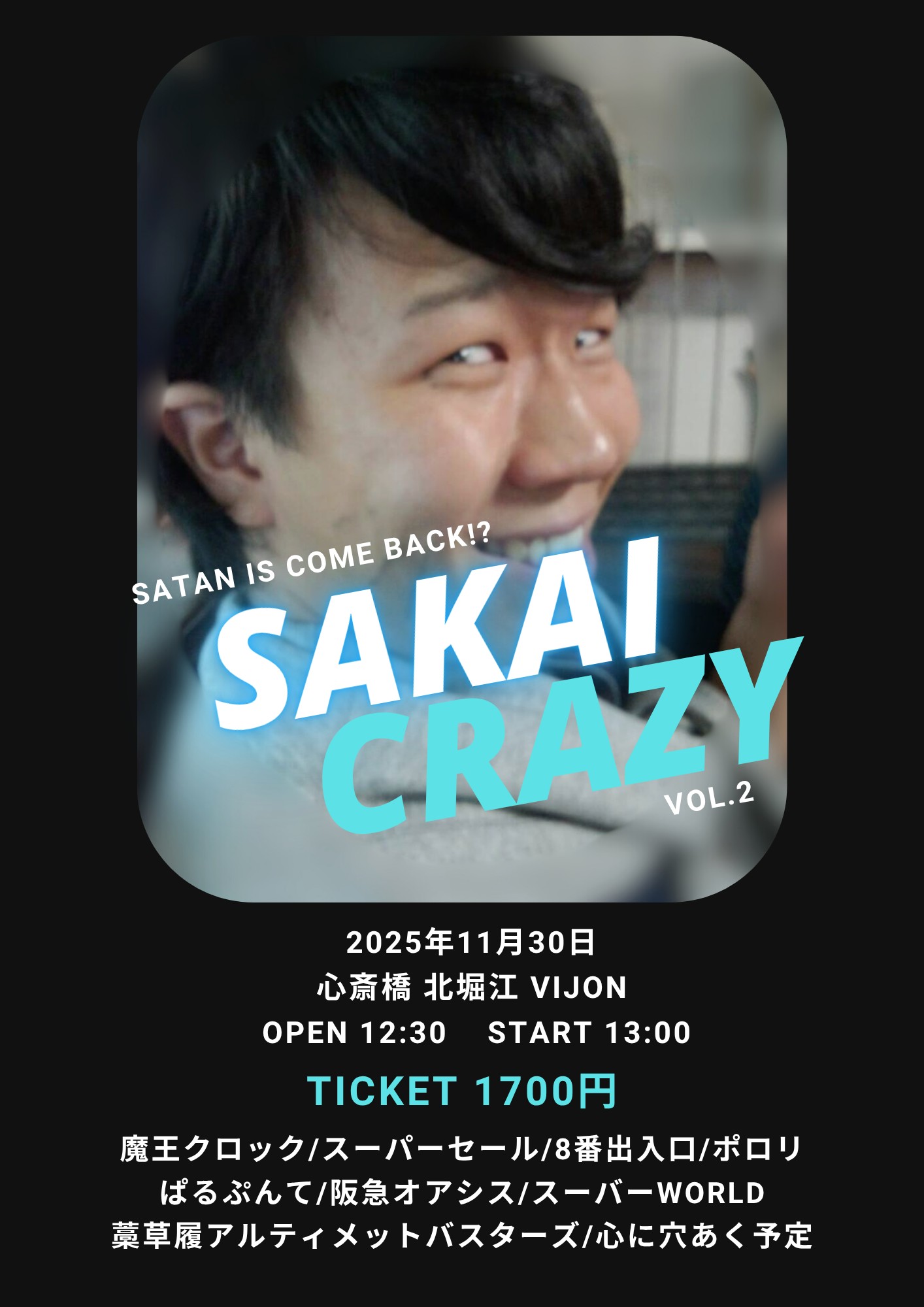 北堀江 club vijon(クラブビジョン) スケジュール 2025.11.30(Sun) 「SAKAI CRAZY vol.2」 [ACT] スーパーセール / 心に穴あく予定 / 阪急オアシス / 藁草履アルティメットバスターズ / ぱるぷんて / ポロリ / スーバーworld / 8番出入口 / 魔王クロック [OPEN/START] 12:30/13:00 [料金] tiket ¥1,000 別途Drink代¥700 会場販売: (問)北堀江club vijon 06-6539-7411 info@vijon.jp 〒550-0014 大阪府大阪市西区北堀江1-22 マインズ北堀江B1