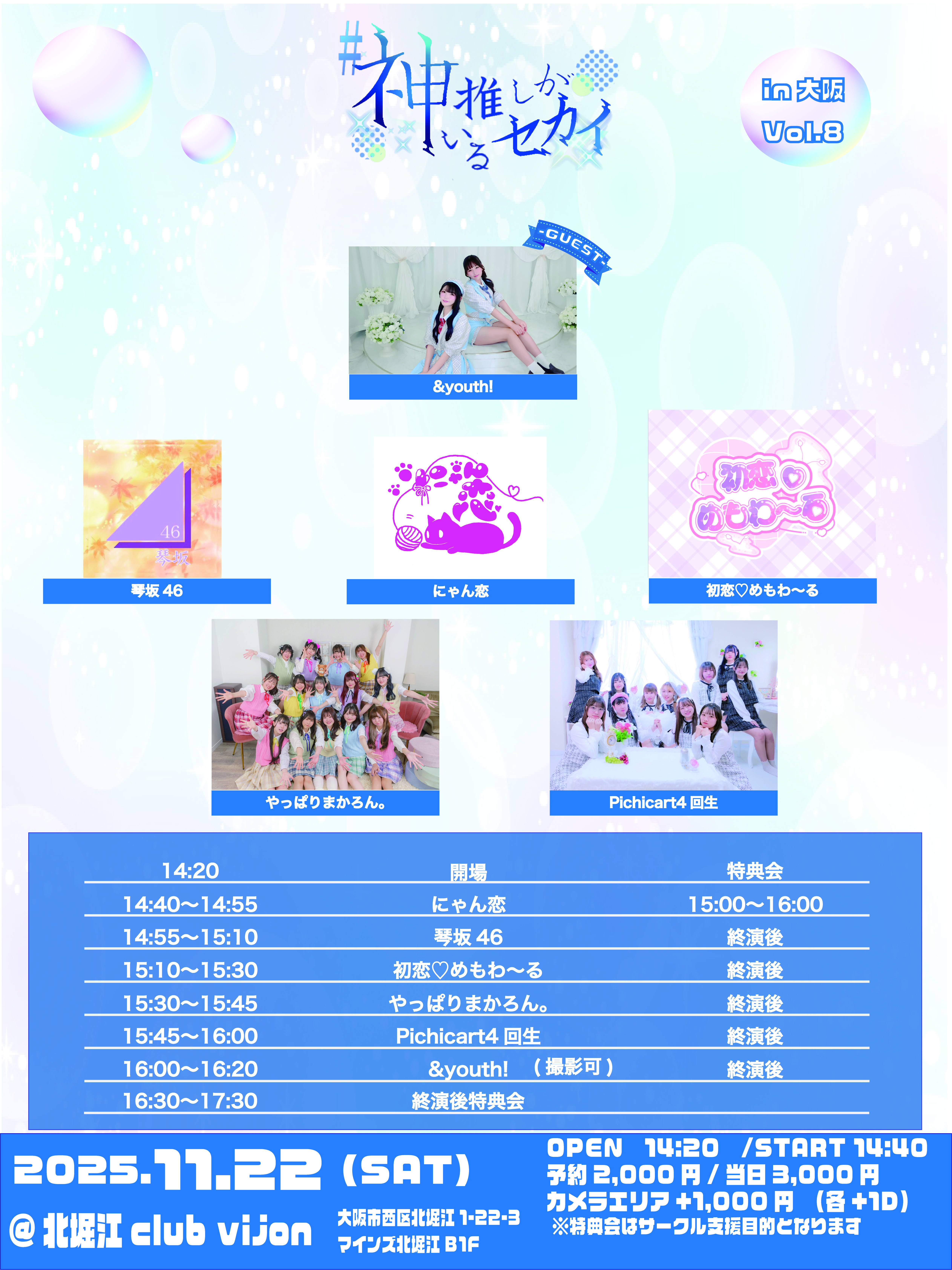 北堀江 club vijon(クラブビジョン) スケジュール 2025.11.22(Sat) #神推しがいるセカイ in 大阪 vol.8 [ACT] -GUEST- &youth! / [act.] 琴坂 46 / にゃん恋 / 初恋♡めもわ~る / やっぱりまかろん。 / Pichicart 4回生 [OPEN/START] 14:20/14:40 [料金] 予約 2,000円 / 当日 3,000円 カメラエリア+1,000円 (各 +1D) ※特典会はサークル支援目的となります。 会場販売:無 (問)北堀江club vijon 06-6539-7411 info@vijon.jp 〒550-0014 大阪府大阪市西区北堀江1-22 マインズ北堀江B1