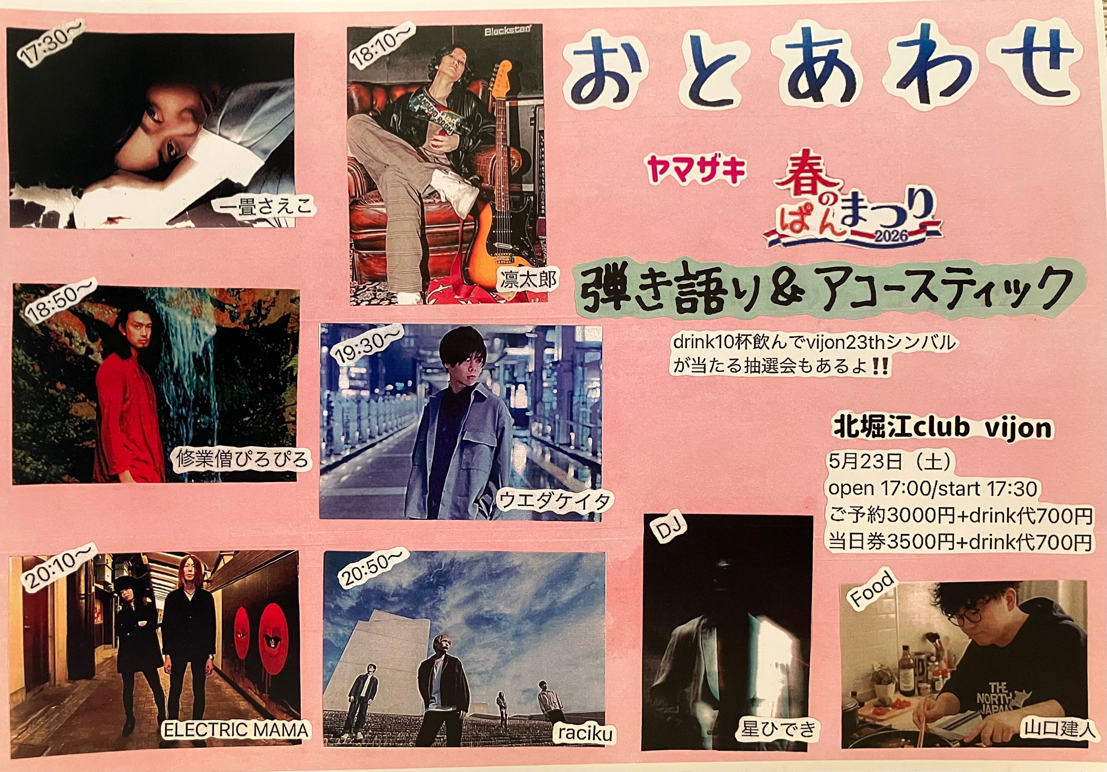 北堀江 club vijon(クラブビジョン) スケジュール 2026.5.23(Sat) おとあわせ 弾き語り&アコースティック [ACT] raciku / ELECTRIC MAMA / ウエダケイタ / 修業僧ぴろぴろ / 凛太郎 / 一畳さえこ / [DJ] 星ひでき / [FOOD] 山口建人 [OPEN/START] 17:00/17:30 [料金] ADV/DOOR ¥3000/¥3500別途Drink代¥700 会場販売: (問)北堀江club vijon 06-6539-7411 info@vijon.jp 〒550-0014 大阪府大阪市西区北堀江1-22 マインズ北堀江B1