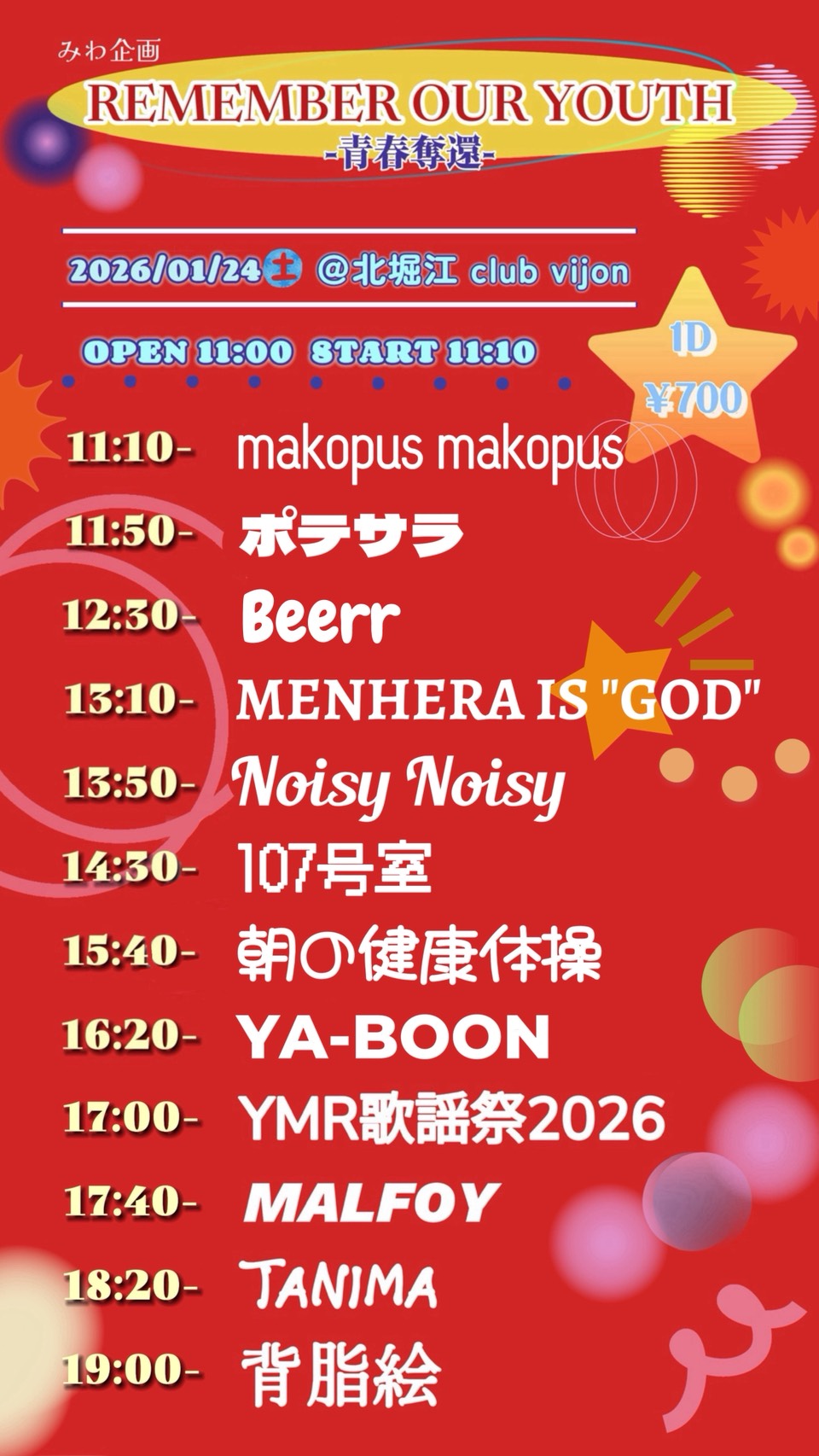 北堀江 club vijon(クラブビジョン) スケジュール 2026.1.24(Sat) みわ企画 [ACT] ポテサラ / MENHERA IS ''GOD'' / Beerr / Noisy Noisy / 107号室 / 朝の健康体操 / YA-BOON / makopus makopus / YMR歌謡祭2026 / MALFOY / TANIMA / 背脂 [OPEN/START] 11:00 / 11:10 [料金] FREE (+1D¥700-) 会場販売: (問)北堀江club vijon 06-6539-7411 info@vijon.jp 〒550-0014 大阪府大阪市西区北堀江1-22 マインズ北堀江B1