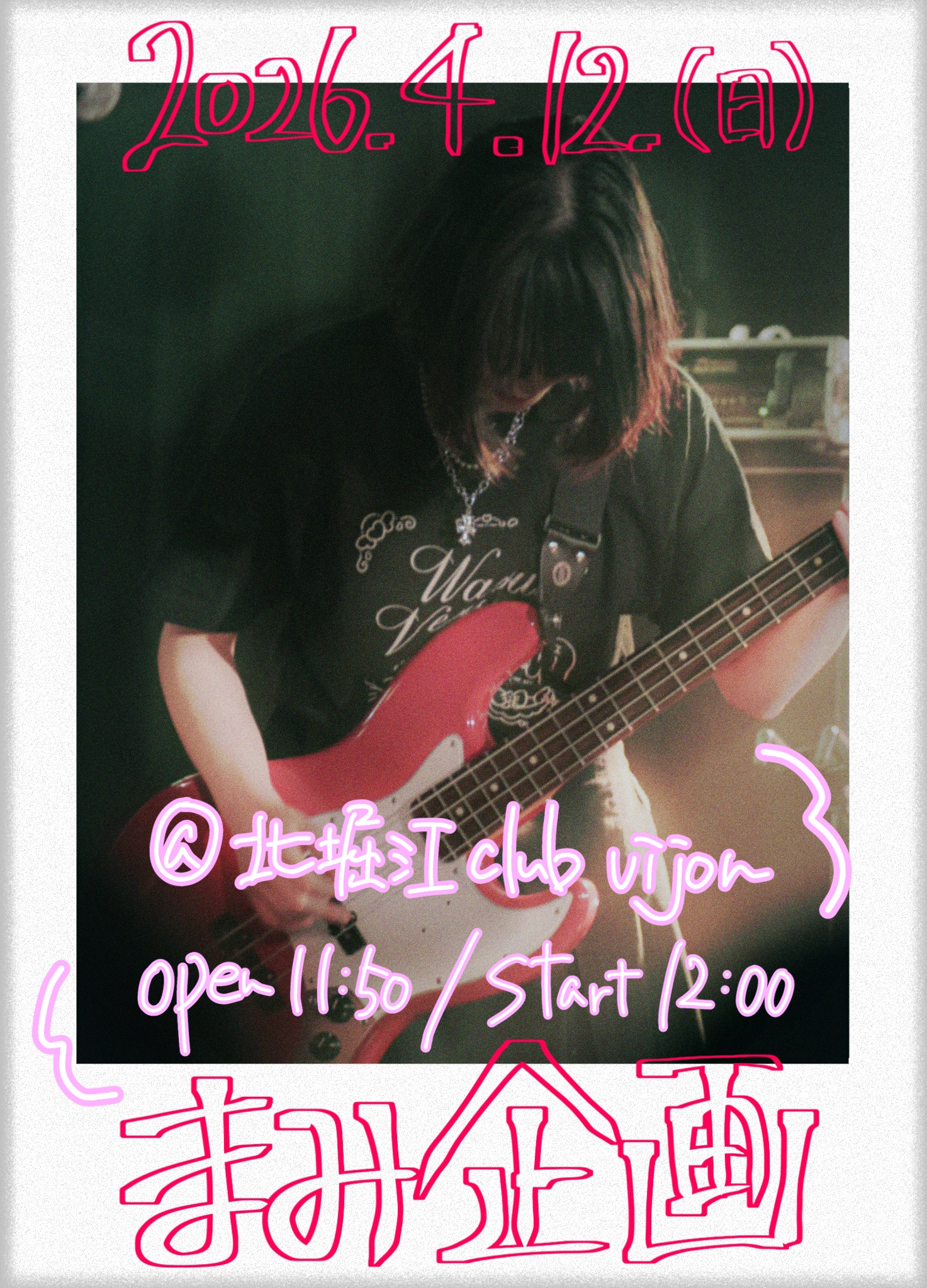 北堀江 club vijon(クラブビジョン) スケジュール 2026.4.12(Sun) まみ企画 [ACT] O chan yori ai wo komete / cyan blue / どーする? / 叫音-ユキネ- / SAILOR MARS / アル中ハイマー / HOT'NGRAFFITY / nettyori / うぉ…wい / ズーパーク / ペロロペロペロ [OPEN/START] 11:50/12:00 [料金] FREE(+1D¥700) 会場販売:無 (問)北堀江club vijon 06-6539-7411 info@vijon.jp 〒550-0014 大阪府大阪市西区北堀江1-22 マインズ北堀江B1