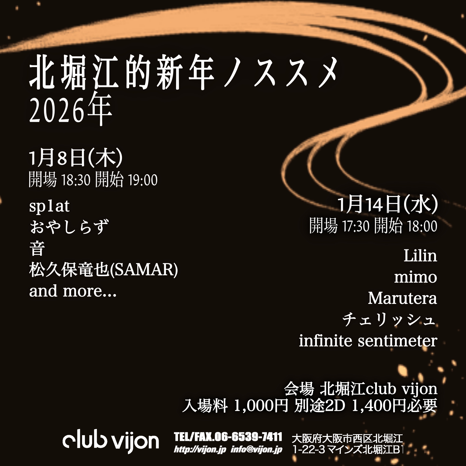北堀江 club vijon(クラブビジョン) スケジュール 2026.1.14(Wed) 【北堀江的新年ノススメ】DAY2 [ACT] Lilin / mimo / Marutera / チェリッシュ / infinite sentimeter [OPEN/START] 17:30 / 18:00 [料金] ADV/DOOR ¥1,000 別途2Drink代¥1,400 (問)北堀江club vijon 06-6539-7411 info@vijon.jp 〒550-0014 大阪府大阪市西区北堀江1-22 マインズ北堀江B1