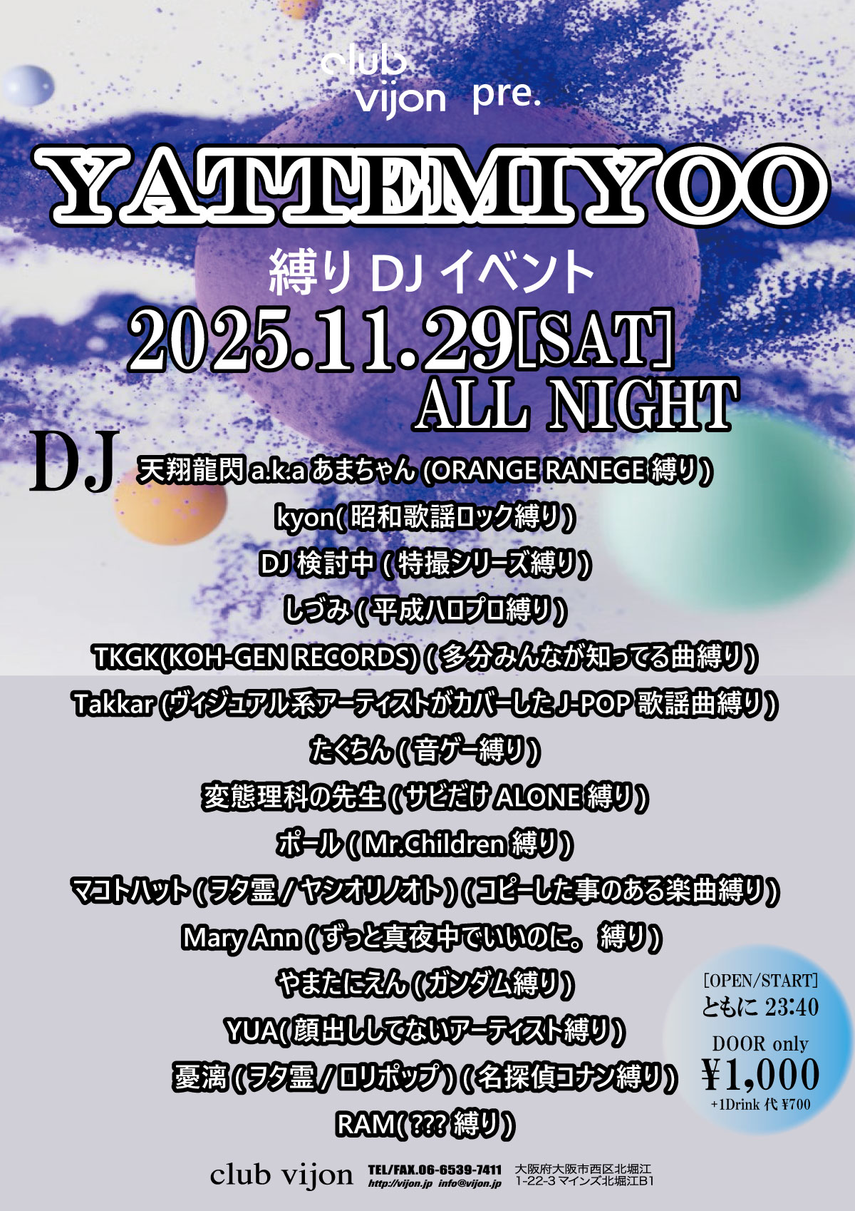 - 天翔龍閃a.k.aあまちゃん(ORANGE RANEGE縛り) / kyon(昭和歌謡ロック縛り) / DJ検討中(特撮シリーズ縛り) / しづみ(平成ハロプロ縛り) / TKGK(KOH-GEN RECORDS) (多分みんなが知ってる曲縛り) / Takkar (ヴィジュアル系アーティストがカバーしたJ-POP歌謡曲縛り) / たくちん(音ゲー縛り) / 変態理科の先生(サビだけALONE縛り) / ポール(Mr.Children縛り) / マコトハット(ヲタ霊/ヤシオリノオト) (コピーした事のある楽曲縛り) / Mary Ann (ずっと真夜中でいいのに。縛り) / やまたにえん(ガンダム縛り) / YUA(顔出ししてないアーティスト縛り) / 憂漓(ヲタ霊/ロリポップ) (名探偵コナン縛り) / RAM(???縛り)