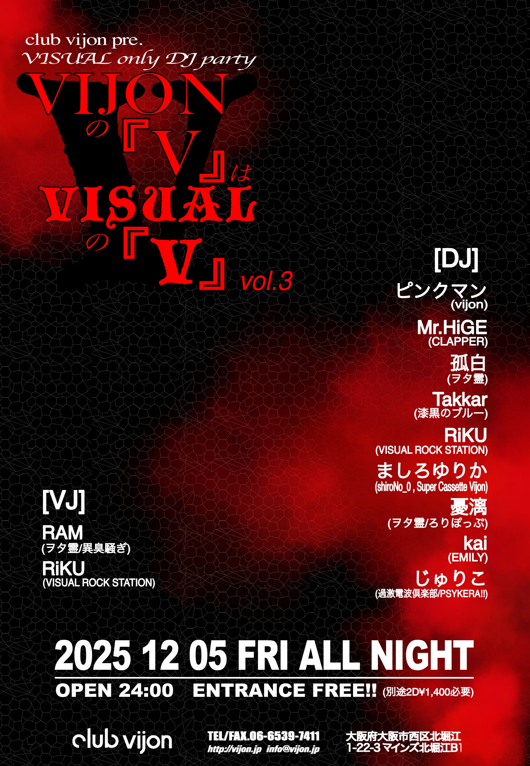 - [DJ] ピンクマン(viojn) / Mr.HiGE(CLAPPER) / 孤白(ヲタ霊) / Takkar(漆黒のブルー) / RiKU(VISUAL ROCK STATION) / ましろゆりか(shiroNo_0 , Super Cassette Vijon) / 憂漓(ヲタ霊/ろりぽっぷ) / kai(EMILY) / じゅりこ(過激電波倶楽部/PSYKERA!!) [VJ] RAM(ヲタ霊/異臭騒ぎ) / RiKU(VISUAL ROCK STATION)