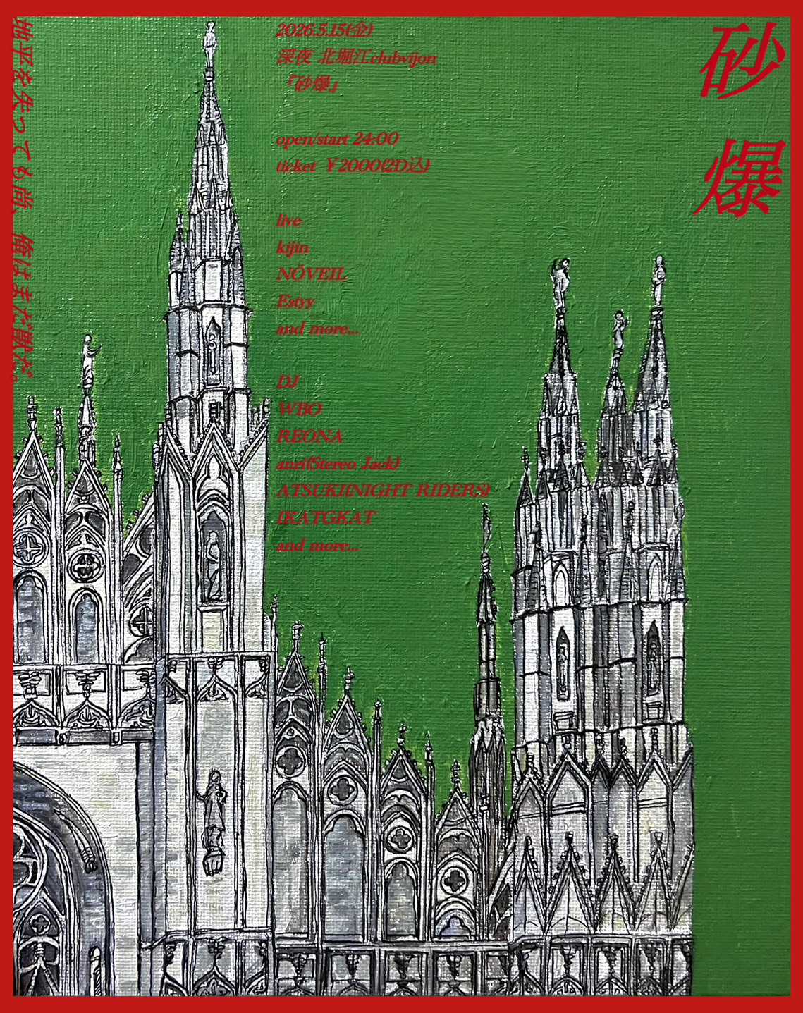 北堀江 club vijon(クラブビジョン) スケジュール 2026.5.15(Fri) kijin pre 【砂漠】 [ACT] 《LIVE》kijin / NÖVEIL / Estyy 《DJ》WBO / REONA / anri(Stereo Jack) / ATSUKI(NIGHT RIDERS) / IKATGKAT [OPEN/START] 24:00 [料金] ticket ¥2,000(2D込) (問)北堀江club vijon 06-6539-7411 info@vijon.jp 〒550-0014 大阪府大阪市西区北堀江1-22 マインズ北堀江B1