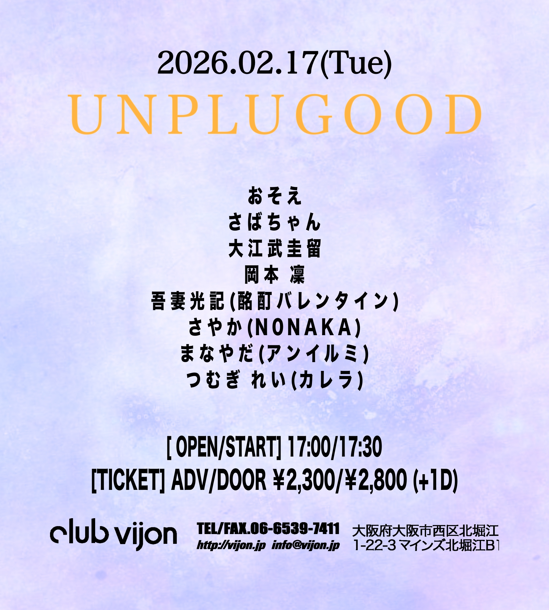 北堀江 club vijon(クラブビジョン) スケジュール 2026.2.17(Tue) 【UNPLUGOOD】vol.8 [ACT] おそえ / さばちゃん / 大江武圭留 / 岡本 凜 / 吾妻光記(酩酊バレンタイン) / さやか(N0NAKA) / まなやだ(アンイルミ) / つむぎ れい(カレラ) [OPEN/START] 17:00 / 17:30 [料金] ADV/DOOR ¥2,300/¥2,800 別途Drink代¥700 会場販売: (問)北堀江club vijon 06-6539-7411 info@vijon.jp 〒550-0014 大阪府大阪市西区北堀江1-22 マインズ北堀江B1