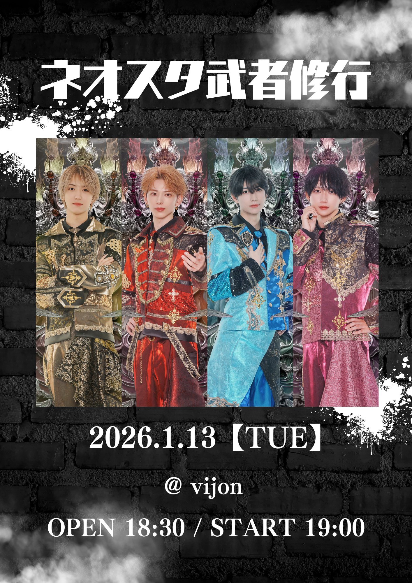 北堀江 club vijon(クラブビジョン) スケジュール 2026.1.13(Tue) ネオスタ武者修行 [ACT] NeoAster [OPEN/START] 18:30/19:00 [料金] DOOR ¥0 別途Drink代¥700 整列▶︎18:00 整番引き▶︎18:15 (問)北堀江club vijon 06-6539-7411 info@vijon.jp 〒550-0014 大阪府大阪市西区北堀江1-22 マインズ北堀江B1