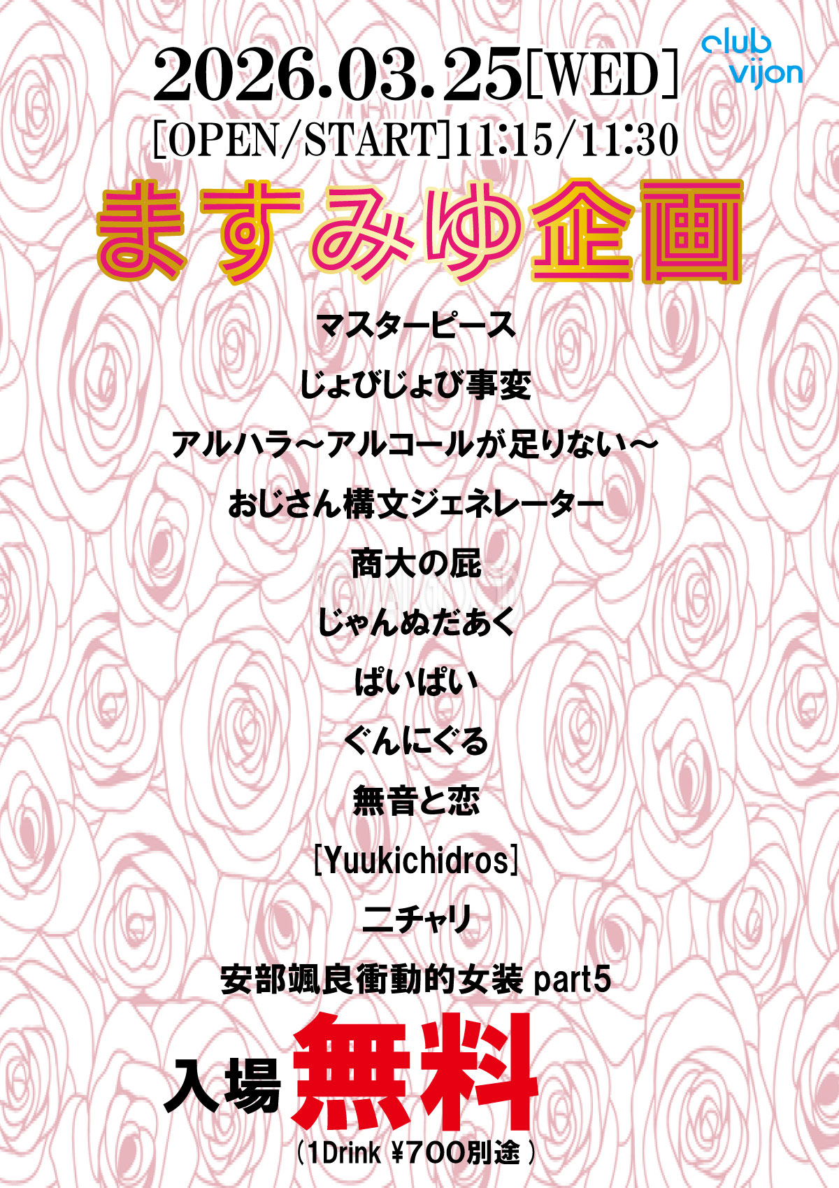 北堀江 club vijon(クラブビジョン) スケジュール 2026.2.19(Thu) ますみゆ企画 [ACT] マスターピース / じょびじょび事変 / アルハラ〜アルコールが足りない〜 / おじさん構文ジェネレーター / 商大の屁 / じゃんぬだあく / ぱいぱい / ぐんにぐる / 無音と恋 / [Yuukichidros] / 二チャリ / 安部颯良衝動的女装part5 [OPEN/START] 11:15/11:30 [料金] 無料(別途1drink代¥700必要) 会場販売: (問)北堀江club vijon 06-6539-7411 info@vijon.jp 〒550-0014 大阪府大阪市西区北堀江1-22 マインズ北堀江B1