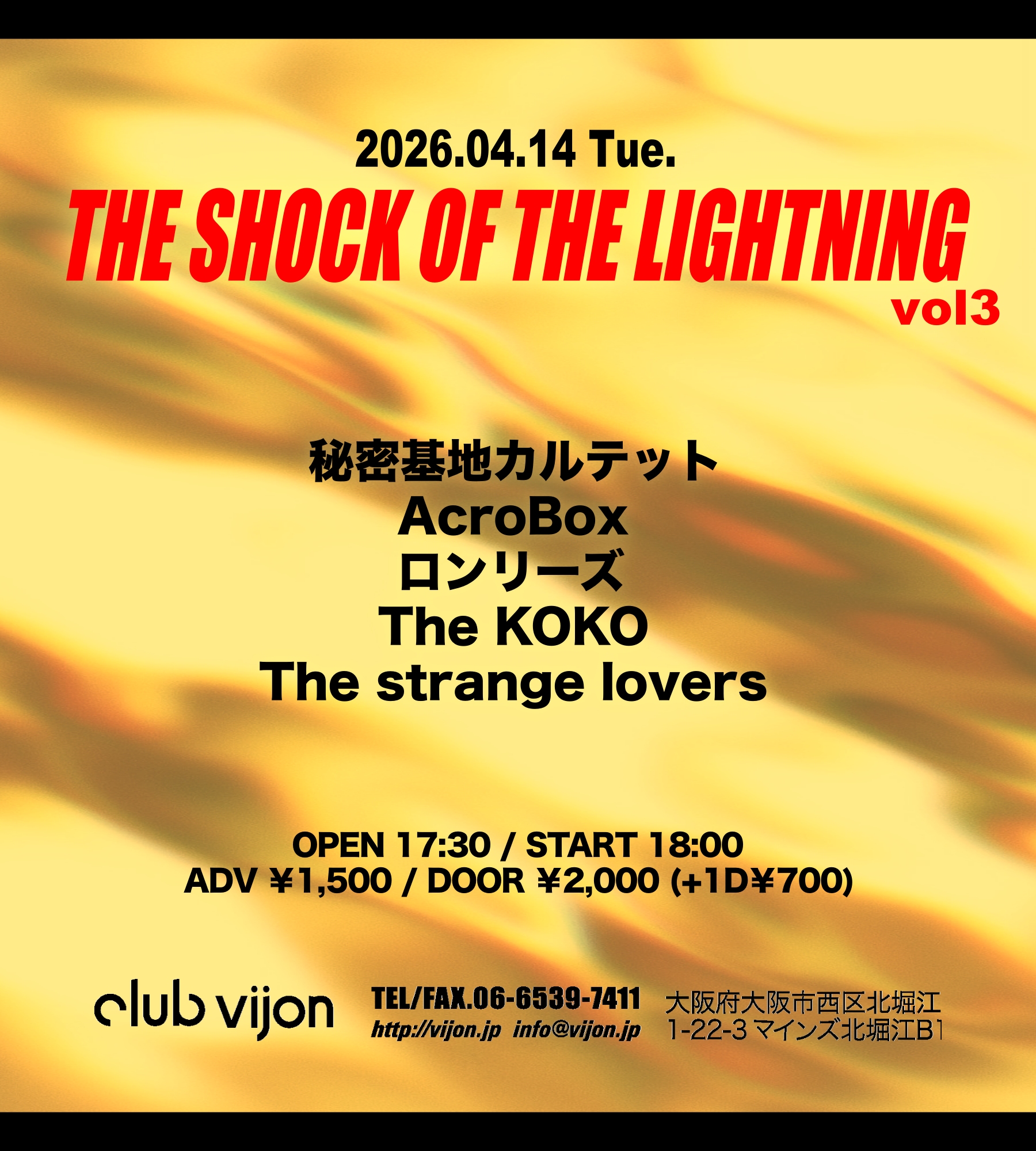 北堀江 club vijon(クラブビジョン) スケジュール 2026.4.14(Tue) 【THE SHOCK OF THE LIGHTNING】vol.3 [ACT] 秘密基地カルテット / AcroBox / ロンリーズ / The KOKO / The strange lovers [OPEN/START] 17:30 / 18:00 [料金] ADV/DOOR ¥1,500/¥2,000 別途Drink代¥700 (問)北堀江club vijon 06-6539-7411 info@vijon.jp 〒550-0014 大阪府大阪市西区北堀江1-22 マインズ北堀江B1