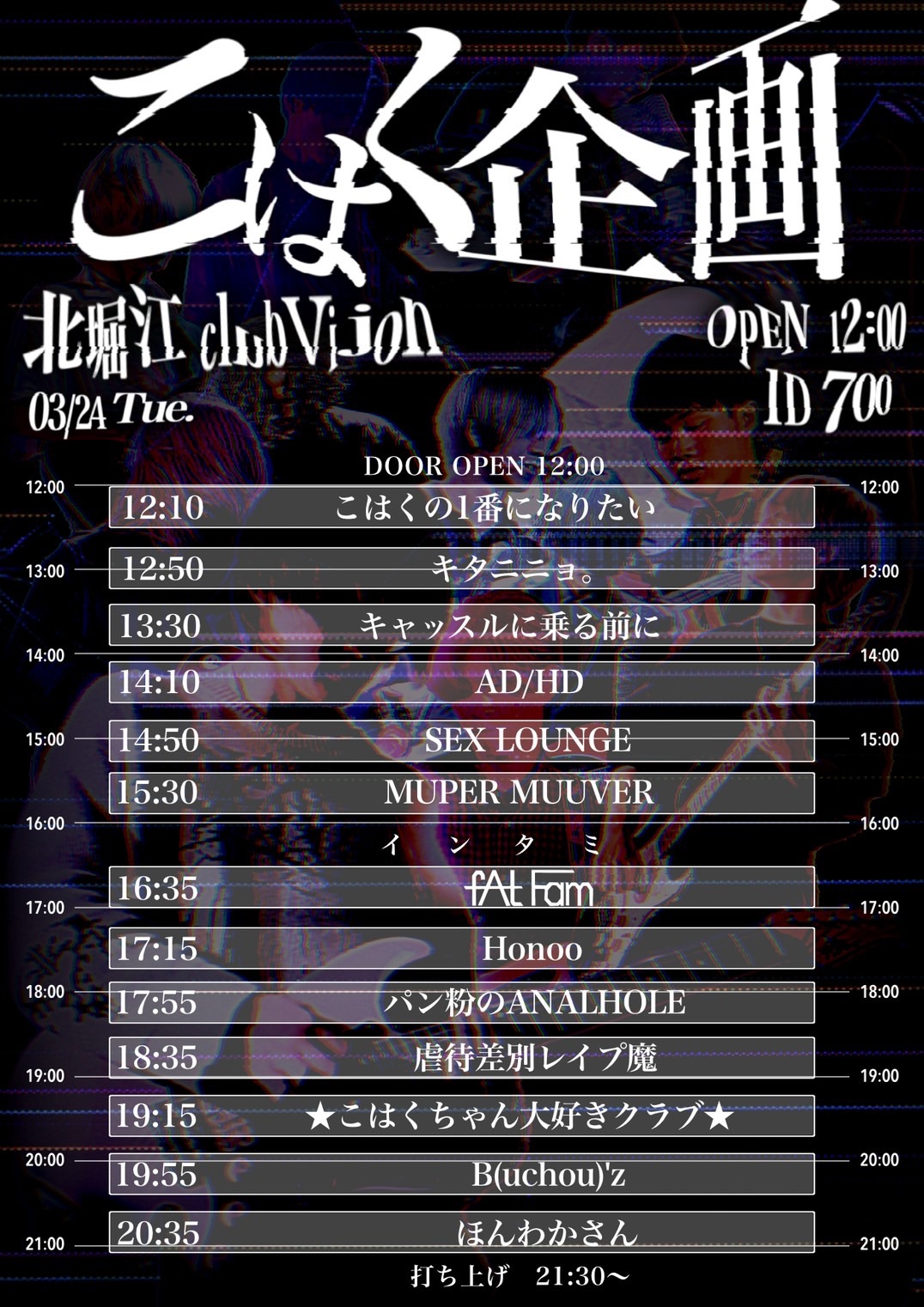 北堀江 club vijon(クラブビジョン) スケジュール 2026.3.24(Tue) こはく企画 [ACT] こはくの1番になりたい / キタニニョ。 / キャッスルに乗る前に / AD/HD / Honoo / MUPER MUUVER / fAt Fam / SEX LOUNGE / パン粉のANALHOLE / 虐待差別レイプ魔 / ★こはくちゃん大好きクラブ★ / B(uchou)’z / ほんわかさん [OPEN/START] 11:30 / 11:40 [料金] FREE(+1D¥700) 会場販売: (問)北堀江club vijon 06-6539-7411 info@vijon.jp 〒550-0014 大阪府大阪市西区北堀江1-22 マインズ北堀江B1
