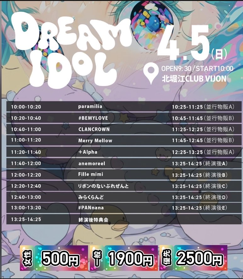 - 女性500円/一般 1900円/優先2500円 当日券は各+500円(別途1D)