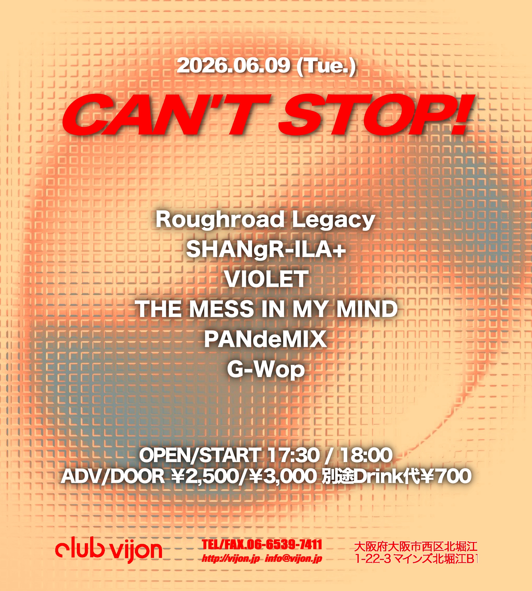 北堀江 club vijon(クラブビジョン) スケジュール 2026.6.09(Tue) 【CAN'T STOP!】 [ACT] Roughroad Legacy / SHANgR-ILA+ / VIOLET / THE MESS IN MY MIND / PANdeMIX / G-Wop [OPEN/START] 17:30 / 18:00 [料金] ADV/DOOR ¥2,500/¥3,000 別途Drink代¥700 会場販売: (問)北堀江club vijon 06-6539-7411 info@vijon.jp 〒550-0014 大阪府大阪市西区北堀江1-22 マインズ北堀江B1