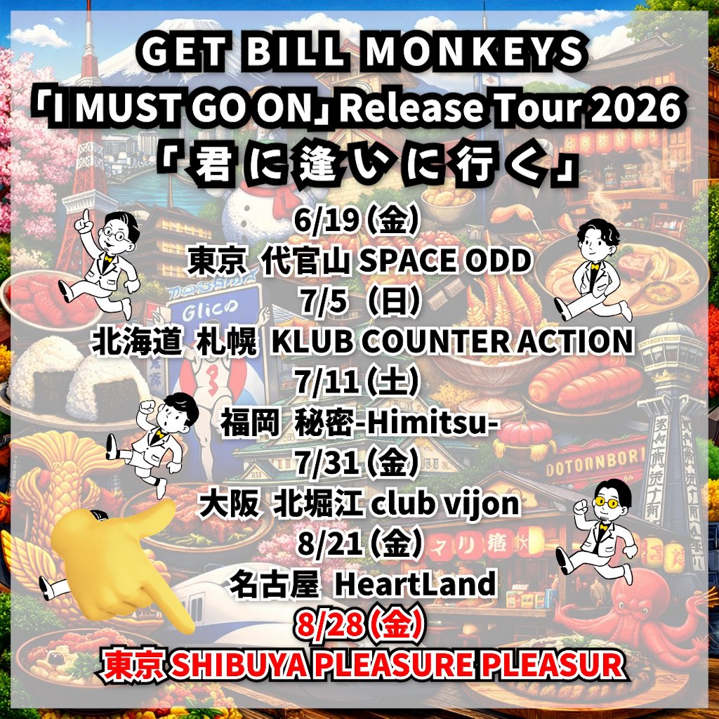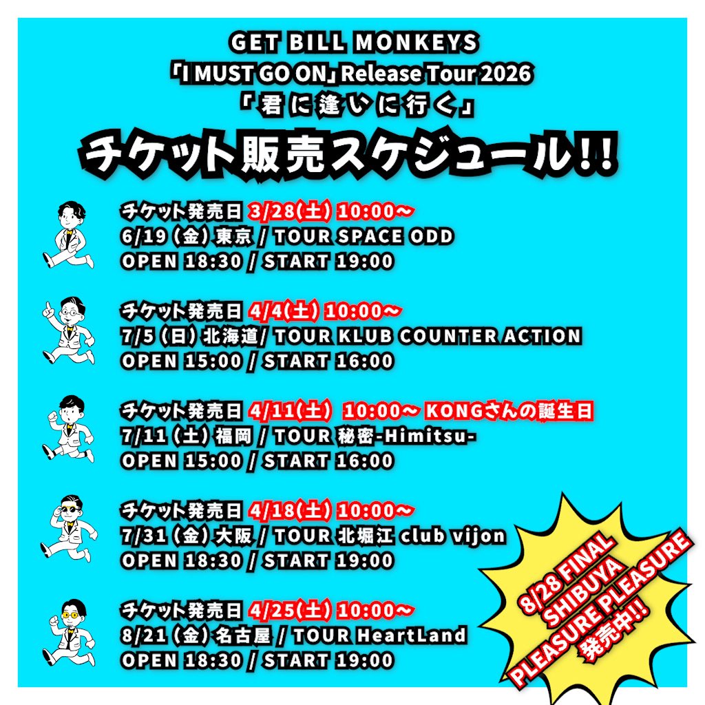北堀江 club vijon(クラブビジョン) スケジュール 2026.7.31(Fri) GET BILL MONKEYS「I MUST GO ON」 Release Tour 2026「君に逢いに行く」 [ACT] GET BILL MONKEYS [OPEN/START] 18:30/19:00 [料金] チケット発売日:4/18 10:00 予定 会場販売: (問)北堀江club vijon 06-6539-7411 info@vijon.jp 〒550-0014 大阪府大阪市西区北堀江1-22 マインズ北堀江B1