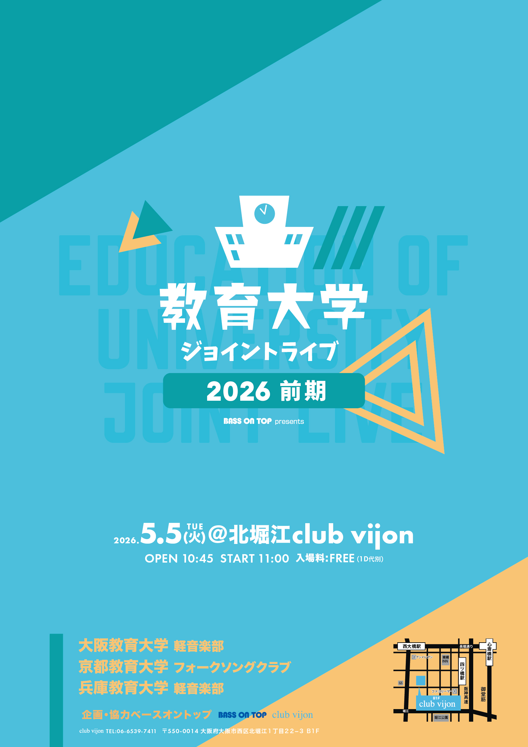 北堀江 club vijon(クラブビジョン) スケジュール 2026.5.05(Tue) BASS ON TOP Presents 教育大学ジョイントライブ2026 -前期- [ACT] 大阪教育大学 軽音楽部 / 京都教育大学 フォークソングクラブ / 兵庫教育大学 軽音楽部 [OPEN/START] 10:45/11:00 [料金] 無料(別途1drink代¥700必要) 会場販売: (問)北堀江club vijon 06-6539-7411 info@vijon.jp 〒550-0014 大阪府大阪市西区北堀江1-22 マインズ北堀江B1