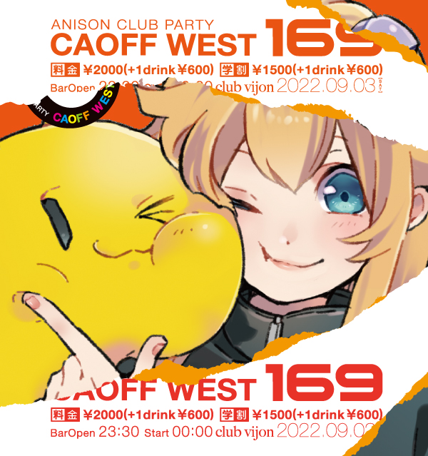 - ///// GUEST DJ ///// 亜樹<NOxlimit!/アニメソングDelight> ラヴ・ポルノ・ミヨシ<MILK BACK DROP/アニデイズ/Sound Rampage/りすらぶ> / ///// GUEST VJ ///// SyuU / ///// DJ ///// moja <CAOFF WEST/MIXBOMB> / SHIMA <CAOFF WEST> / kyon <CAOFF WEST> / タカノ<CAOFF WEST/シマナイト> / りゅうが<アニシス/BRAVE RAVE> / ///// VJ ///// やましぃ <ノノレカソノレカ/アニカフェスタ/ノミタイナ> / みのり<AxE/MIXBOMB/アニメソングDelight>
