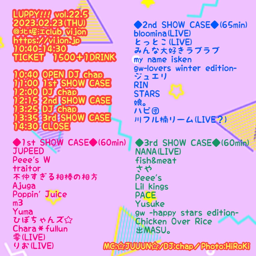 - ◆1st SHOW CASE◆ / JUPEED / Peee's W / traitor / 不仲すぎる相棒の相方 / Poppin' Juice / m3 / Yuma / ひぽちゃんズ☆ / Chara*fullun / 零(LIVE) / りお(LIVE) / ◆2nd SHOW CASE◆ / bloomina(LIVE) / とっとこ(LIVE) / みんな大好きラブラブ / my name isken / gw-lovers winter edition- / ハロピノ / RIN / STARS / 娘。 / ハピ団 / 川フル楠リーム(LIVE?) / ◆3rd SHOW CASE◆ / NANA(LIVE) / fish&meat / さや / Peee's / Lil kings / PACE / Yusuke / gw -happy stars edition- / Chicken Over Rice / 出MASU。
