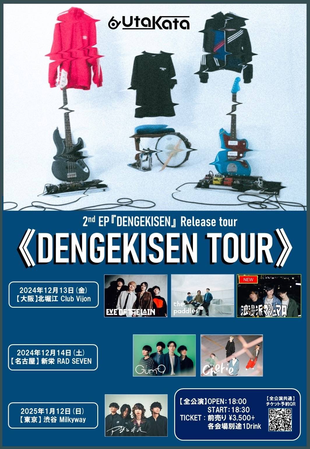 北堀江 club vijon(クラブビジョン) スケジュール 2024.12.13(Fri) UtaKata DENGEKISEN tour [ACT] UtaKata / the paddles / EVE OF THE LAIN / 浪漫派マシュマロ [OPEN/START] 18:00/18:30 [料金] ADV/DOOR ¥3,500 / ¥4,000 別途Drink代¥600 (問)北堀江club vijon 06-6539-7411 info@vijon.jp 〒550-0014 大阪府大阪市西区北堀江1-22 マインズ北堀江B1
