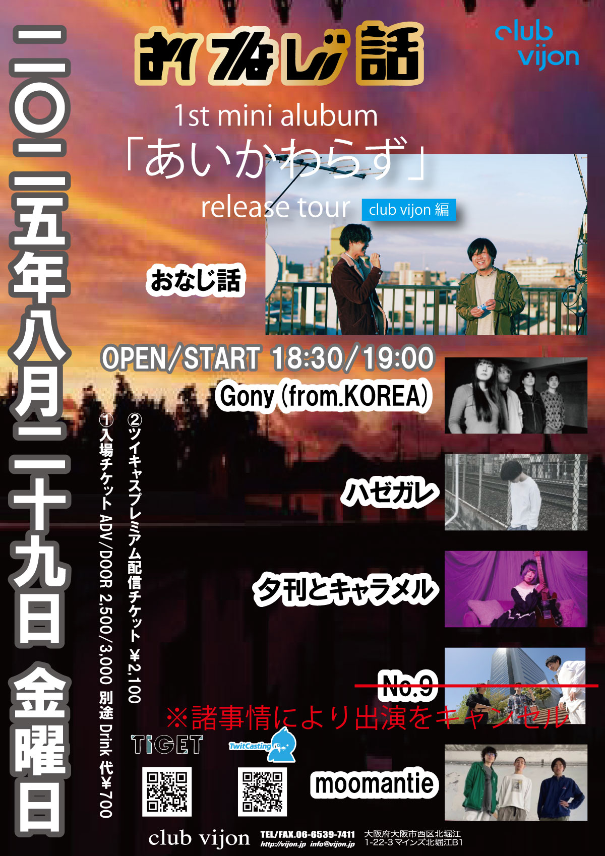 - おなじ話 / Gony(from.KOREA) / ハゼガレ / 夕刊とキャラメル / moomantie ※出演予定のNo.9ですが、諸事情により出演をキャンセルとなりました。