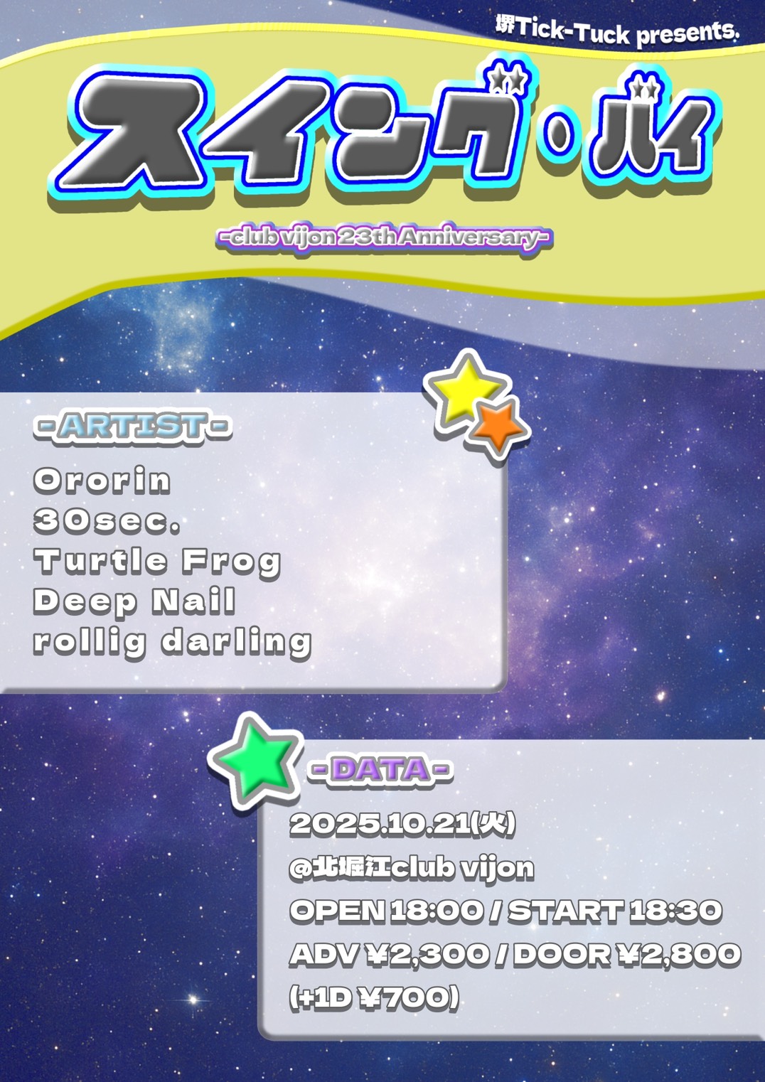 北堀江 club vijon(クラブビジョン) スケジュール 2025.10.21(Tue) 堺Tick-Tuck presents. 「 スイング・バイ -club vijon 23th Anniversary-」 [ACT] Ororin / 30sec. / Turtle Frog / Deep Nail / rolling darling [OPEN/START] 18:00 / 18:30 [料金] ADV ¥2,300 / DOOR ¥2,800 +1D¥700 (問)北堀江club vijon 06-6539-7411 info@vijon.jp 〒550-0014 大阪府大阪市西区北堀江1-22 マインズ北堀江B1