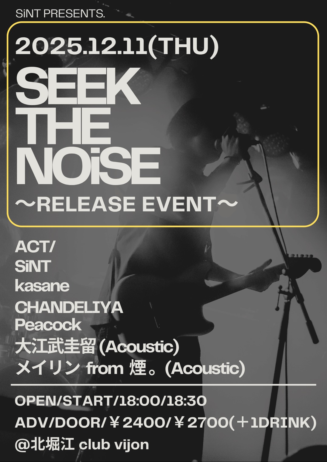 北堀江 club vijon(クラブビジョン) スケジュール 2025.12.11(Thu) SiNT ''SEEK THE NOiSE''リリースイベント [ACT] SiNT / kasane / シャンデリヤ / 大江武圭留 / メイリン / Peacock [OPEN/START] 18:00/18:30 [料金] ADV/DOOR/¥2400/¥2700(+1DRINK¥700) (問)北堀江club vijon 06-6539-7411 info@vijon.jp 〒550-0014 大阪府大阪市西区北堀江1-22 マインズ北堀江B1