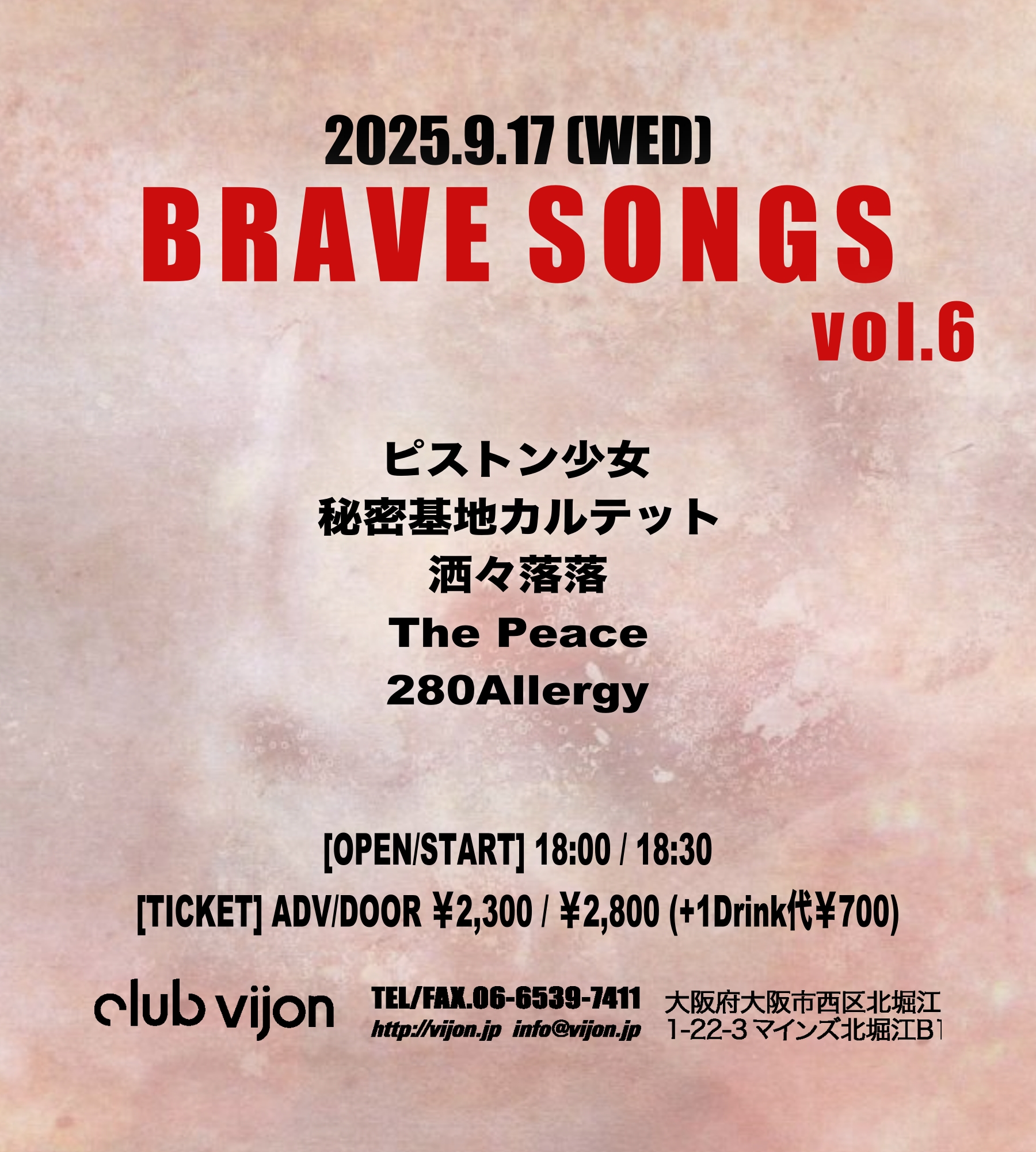 北堀江 club vijon(クラブビジョン) スケジュール 2025.9.17(Wed) 【BRAVE SONGS】vol.6 [ACT] ピストン少女 / 秘密基地カルテット / 洒々落落 / The Peace / 280Allergy [OPEN/START] 18:00 / 18:30 [料金] ADV/DOOR ¥2,300/¥2,800 別途Drink代¥700 会場販売: (問)北堀江club vijon 06-6539-7411 info@vijon.jp 〒550-0014 大阪府大阪市西区北堀江1-22 マインズ北堀江B1