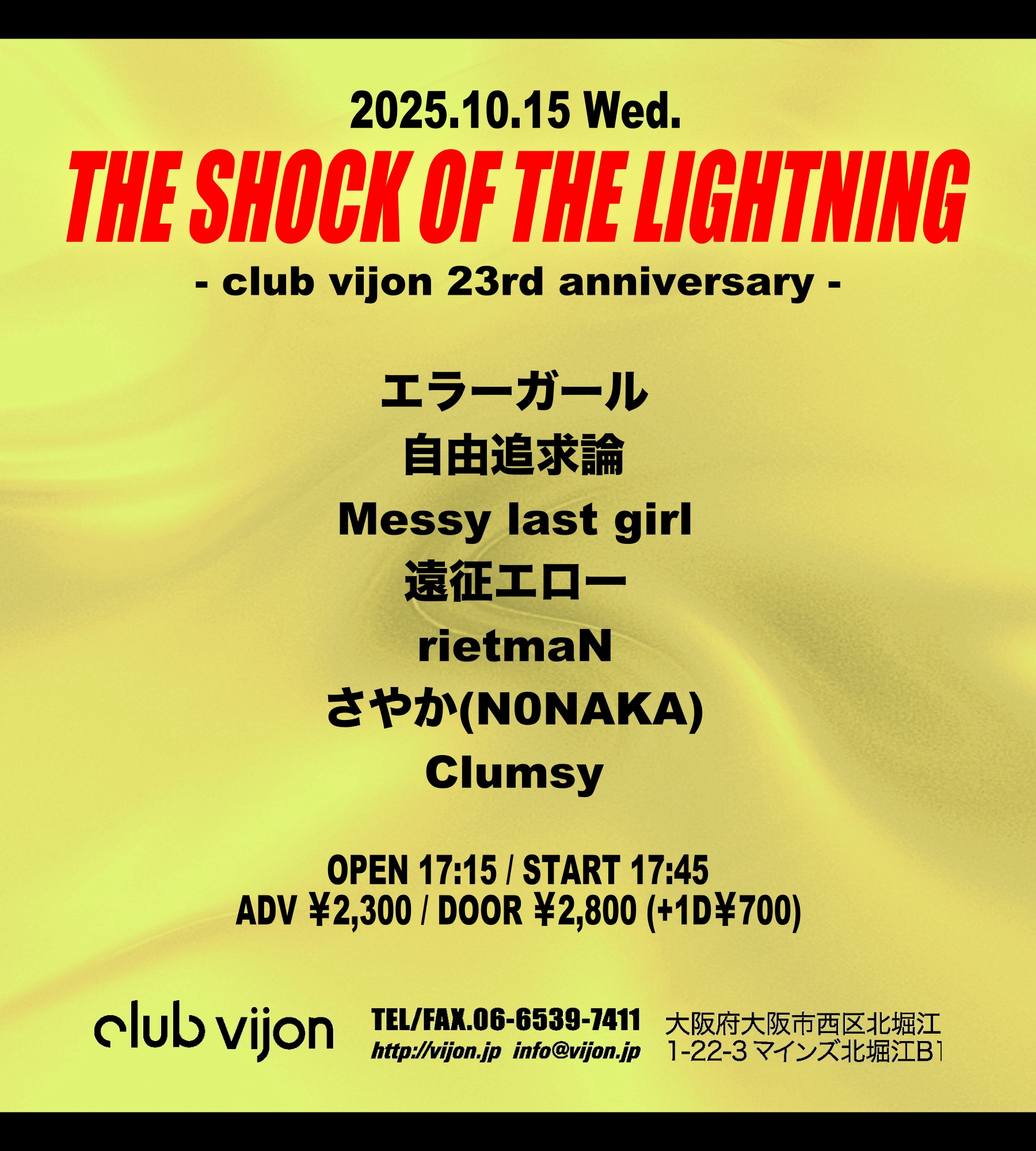 北堀江 club vijon(クラブビジョン) スケジュール 2025.10.15(Wed) 【THE SHOCK OF THE LIGHTNING】- club vijon 23rd anniversary - [ACT] エラーガール / 自由追求論 / Messy last girl / 遠征エロー / rietmaN / さやか(N0NAKA) / Clumsy [OPEN/START] 17:15 / 17:45 [料金] ADV/DOOR ¥2,300 / ¥2,800 別途Drink代¥700 (問)北堀江club vijon 06-6539-7411 info@vijon.jp 〒550-0014 大阪府大阪市西区北堀江1-22 マインズ北堀江B1