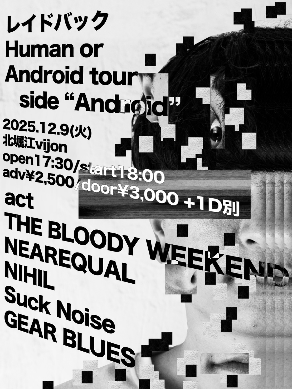 北堀江 club vijon(クラブビジョン) スケジュール 2025.12.09(Tue) レイドバック「Human or Android tour side”Android”」 [ACT] レイドバック / THE BLOODY WEEKEND / NEAREQUAL / NIHIL / Suck Noise / GEAR BLUES [OPEN/START] 17:30 / 18:00 [料金] ADV/DOOR ¥2,500/¥3,000 別途Drink代¥700 (問)北堀江club vijon 06-6539-7411 info@vijon.jp 〒550-0014 大阪府大阪市西区北堀江1-22 マインズ北堀江B1
