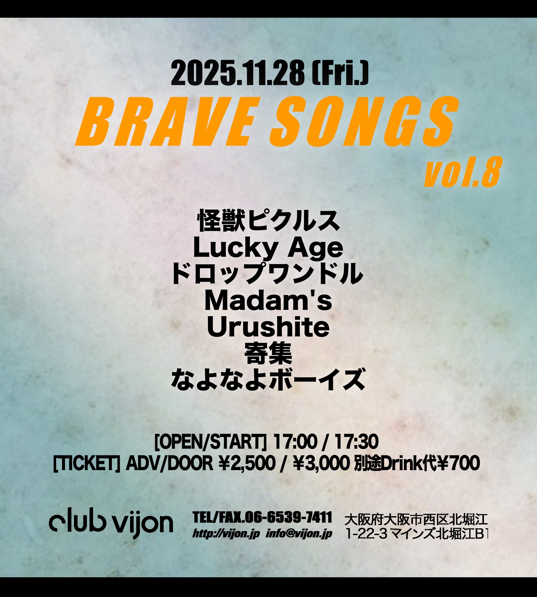 北堀江 club vijon(クラブビジョン) スケジュール 2025.11.28(Fri) 【BRAVE SONGS】vol.8 [ACT] 怪獣ピクルス / Lucky Age /ドロップワンドル / Madam's / Urushite / 寄集 / なよなよボーイズ [OPEN/START] 17:00 / 17:30 [料金] ADV/DOOR ¥2,500 / ¥3,000 別途Drink代¥700 会場販売: (問)北堀江club vijon 06-6539-7411 info@vijon.jp 〒550-0014 大阪府大阪市西区北堀江1-22 マインズ北堀江B1