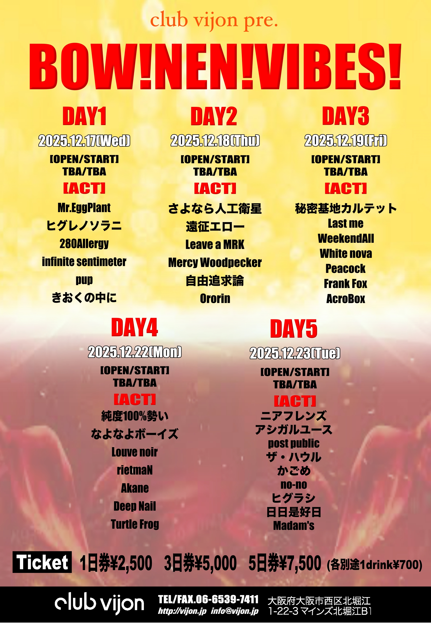 北堀江 club vijon(クラブビジョン) スケジュール 2025.12.18(Thu) 【BOW!NEN!VIBES!】DAY2 [ACT] さよなら人工衛星 / 遠征エロー / Leave a MRK / Mercy Woodpecker / 自由追求論 / Ororin / and more... [OPEN/START] TBA/TBA [料金] 1日券¥2,500 3日券¥5,000 5日券¥7,500 (それぞれ別途1drink¥700頂戴します。) 会場販売: (問)北堀江club vijon 06-6539-7411 info@vijon.jp 〒550-0014 大阪府大阪市西区北堀江1-22 マインズ北堀江B1