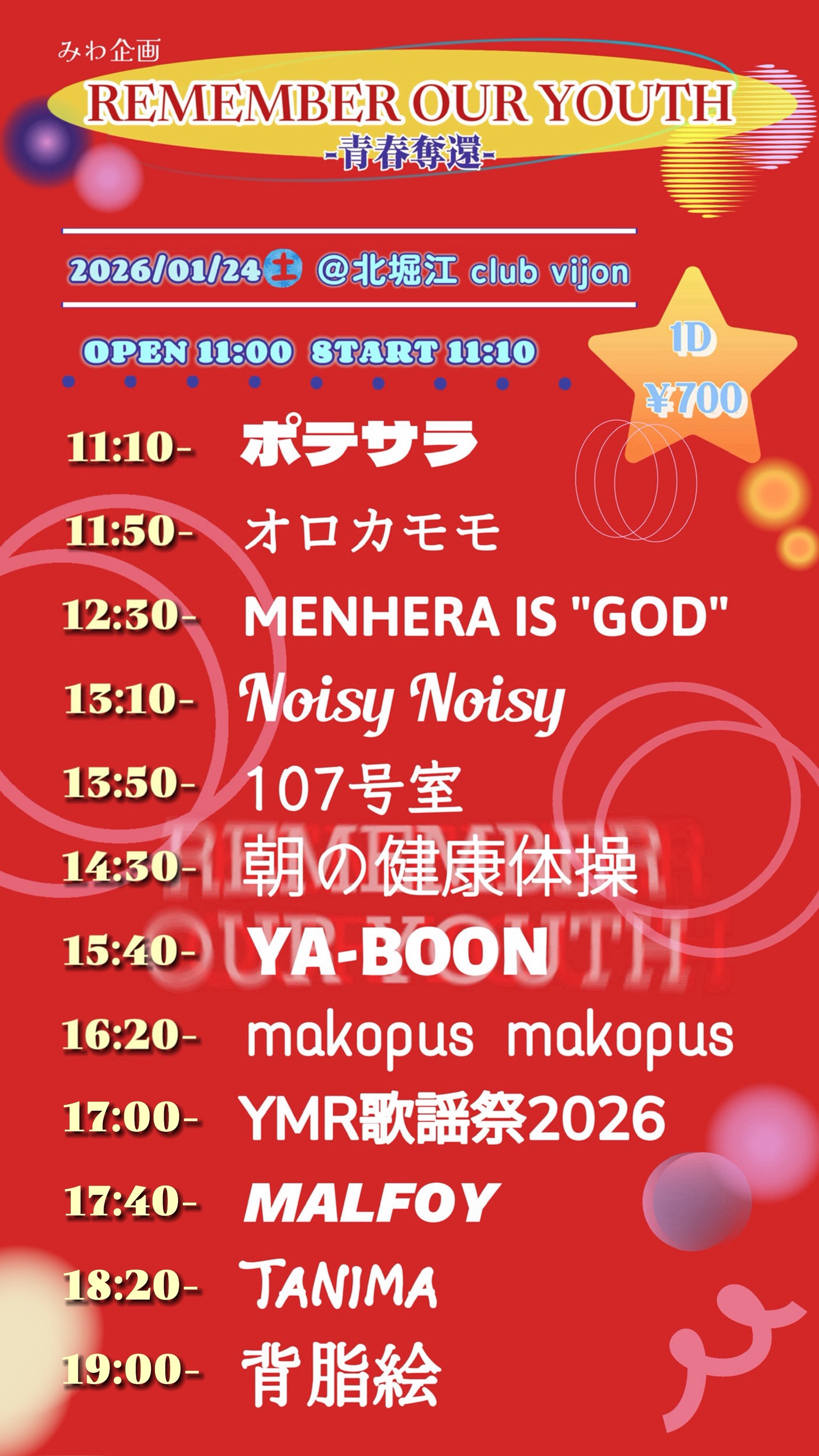 北堀江 club vijon(クラブビジョン) スケジュール 2026.1.24(Sat) みわ企画 [ACT] ポテサラ / オロカモモ / MENHERA IS ''GOD'' / Noisy Noisy / 107号室 / 朝の健康体操 / YA-BOON / makopus makopus / YMR歌謡祭2026 / MALFOY / TANIMA / 背脂 [OPEN/START] 11:00 / 11:10 [料金] FREE (+1D¥700-) 会場販売: (問)北堀江club vijon 06-6539-7411 info@vijon.jp 〒550-0014 大阪府大阪市西区北堀江1-22 マインズ北堀江B1