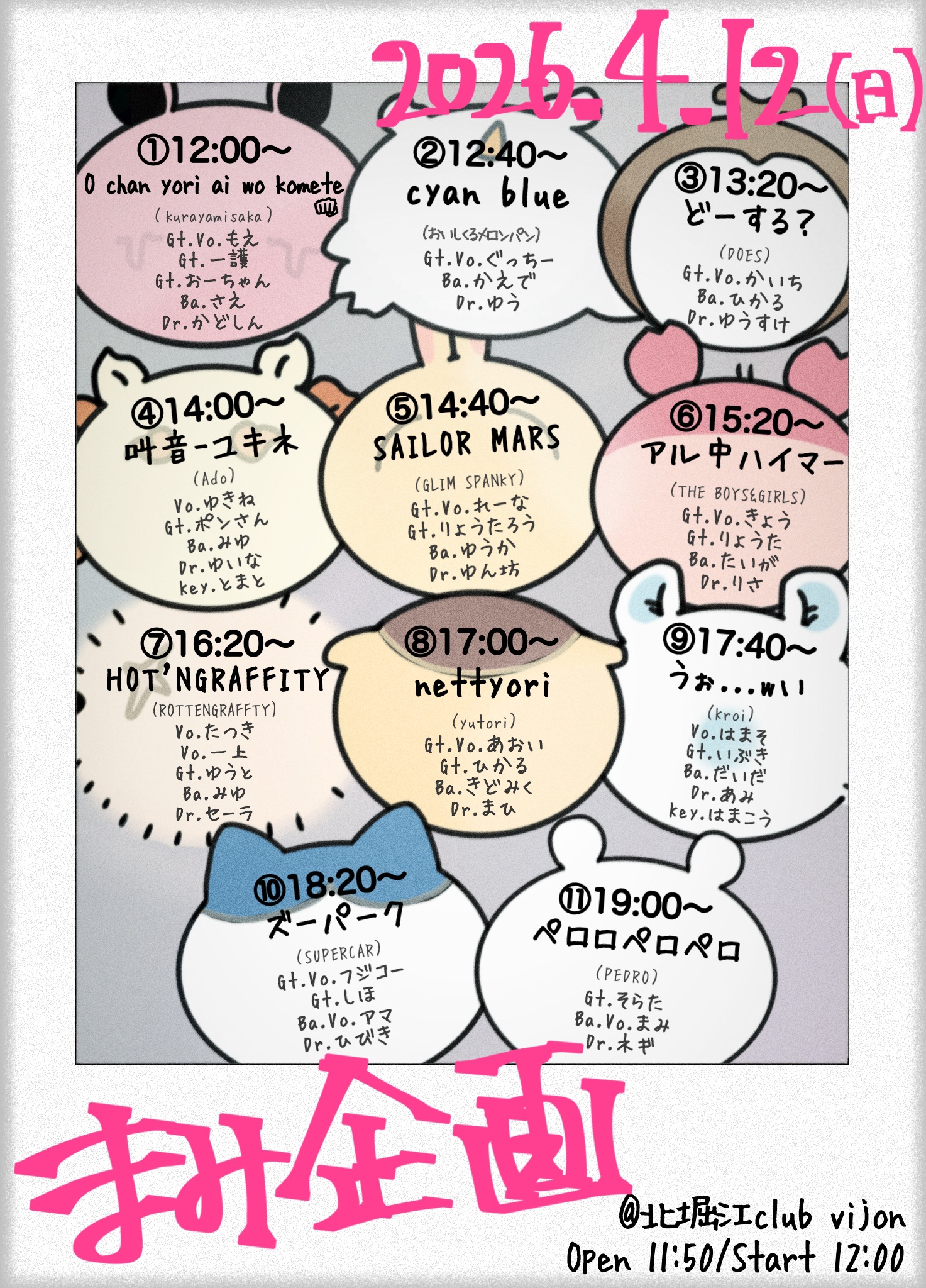 北堀江 club vijon(クラブビジョン) スケジュール 2026.4.12(Sun) まみ企画 [ACT] O chan yori ai wo komete / cyan blue / どーする? / 叫音-ユキネ- / SAILOR MARS / アル中ハイマー / HOT'NGRAFFITY / nettyori / うぉ…wい / ズーパーク / ペロロペロペロ [OPEN/START] 11:50/12:00 [料金] FREE(+1D¥700) 会場販売:無 (問)北堀江club vijon 06-6539-7411 info@vijon.jp 〒550-0014 大阪府大阪市西区北堀江1-22 マインズ北堀江B1