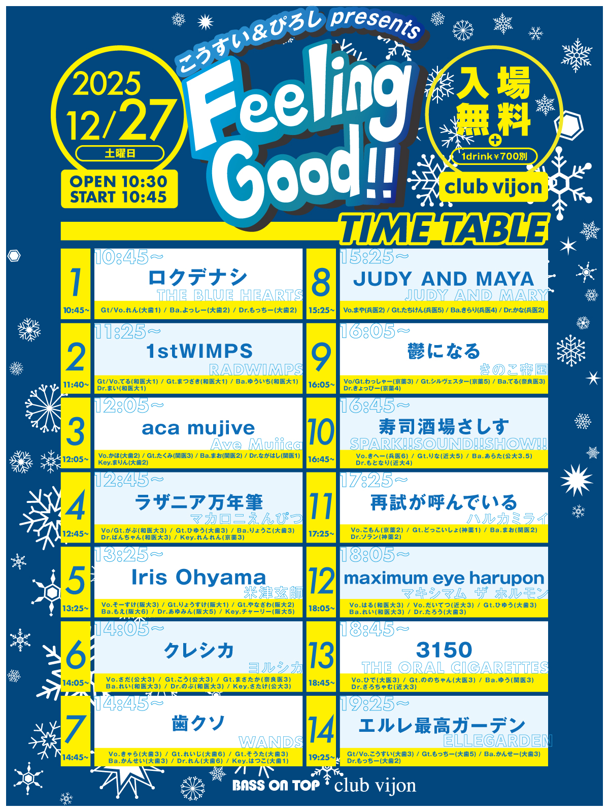 - ロクデナシ / Iris Ohyama / JUDY AND MAYA / 鬱になる / maximum eye harupon / ラザニア万年筆 / aca mujive / 3150 / 歯クソ / クレシカ / 再試が呼んでいる / 寿司酒場さしす / 1stWIMPS / エルレ最高ガーデン