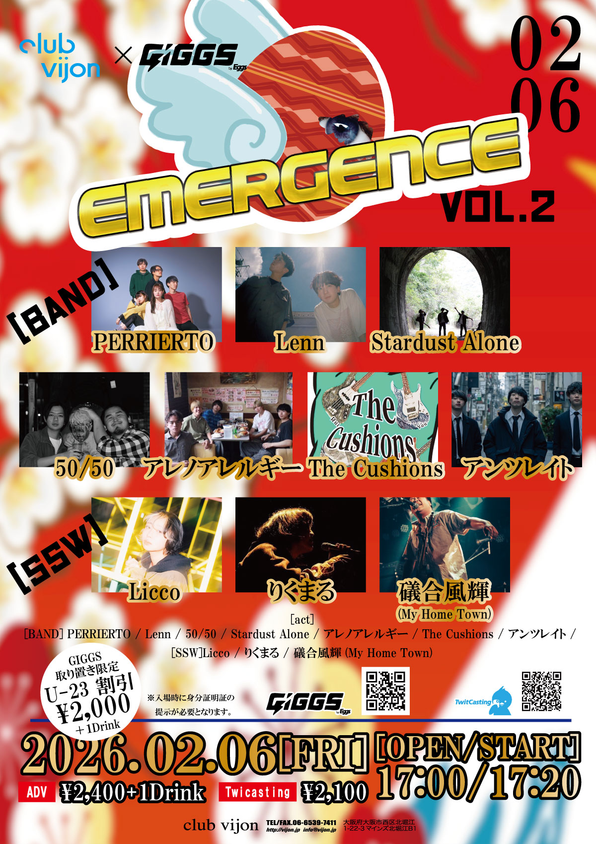 - ①入場チケットADV/DOOR ¥2,400/¥2,900 別途Drink代¥700 (GIGGS)【GIGGS取り置き限定】 U-23:ADV ¥2,000(+1Drink ¥700) ※入場時に身分証明証の提示が必要となります。 ②ツイキャスプレミアム配信チケット ¥2,100 (ツイキャス)