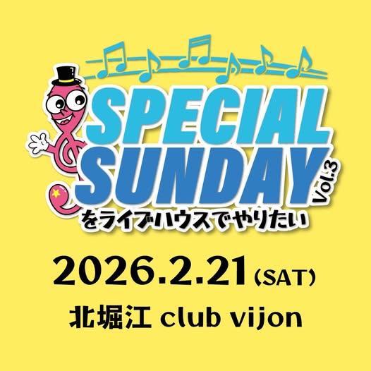 北堀江 club vijon(クラブビジョン) スケジュール 2026.2.21(Sat) Special SundayをライブハウスでやりたいVol.3 [ACT] スペシャルサンデー/カナデルズ/the qloud9/レベッチ/ボカロ好きの会 [OPEN/START] 9:30/10:00 [料金] 前売2,000 当日2,500 別途Drink代¥700 会場販売:無 (問)北堀江club vijon 06-6539-7411 info@vijon.jp 〒550-0014 大阪府大阪市西区北堀江1-22 マインズ北堀江B1