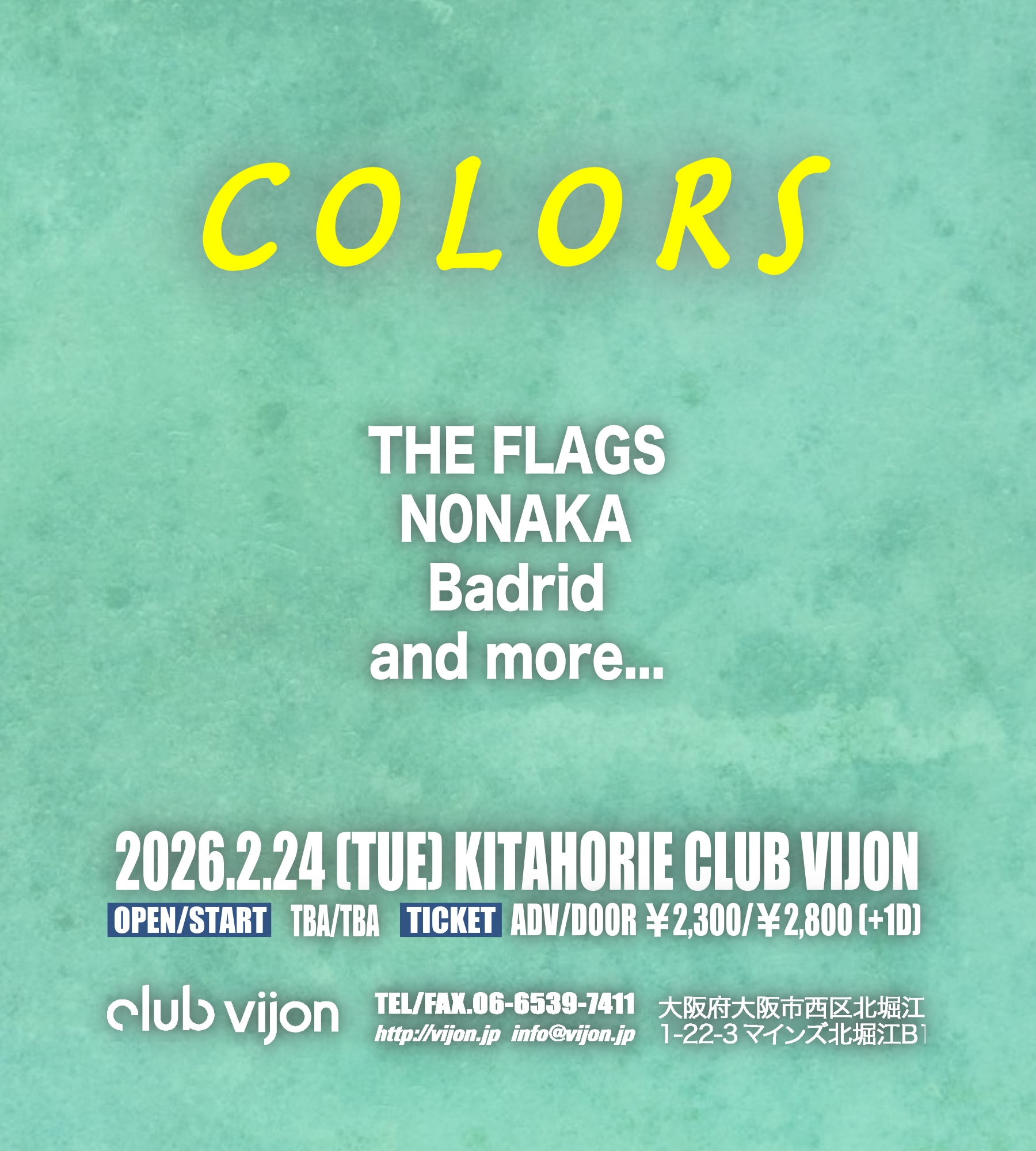 北堀江 club vijon(クラブビジョン) スケジュール 2026.2.24(Tue) 【COLORS】 [ACT] THE FLAGS / N0NAKA / Badrid / and more... [OPEN/START] TBA/TBA [料金] ADV/DOOR ¥2,300/¥2,800 別途Drink代¥700 会場販売: (問)北堀江club vijon 06-6539-7411 info@vijon.jp 〒550-0014 大阪府大阪市西区北堀江1-22 マインズ北堀江B1
