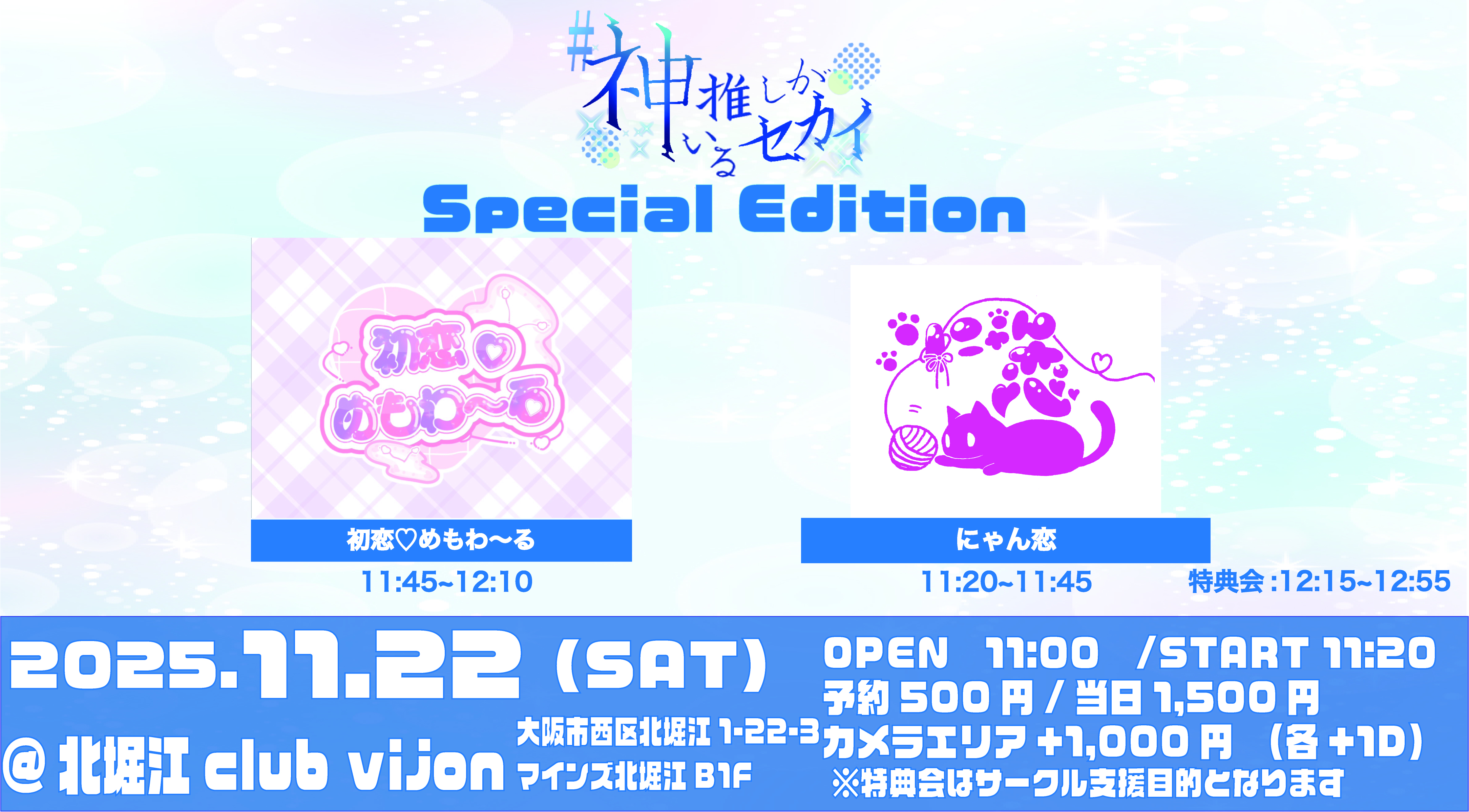 北堀江 club vijon(クラブビジョン) スケジュール 2025.11.22(Sat) #神推しがいるセカイ Special Edition [ACT] にゃん恋 / 初恋♡めもわ~る [OPEN/START] 11:00/11:20 [料金] 予約 500円 / 当日 1,500円 カメラエリア+1,000円 (各 +1D) ※特典会はサークル支援目的となります。 会場販売:無 (問)北堀江club vijon 06-6539-7411 info@vijon.jp 〒550-0014 大阪府大阪市西区北堀江1-22 マインズ北堀江B1