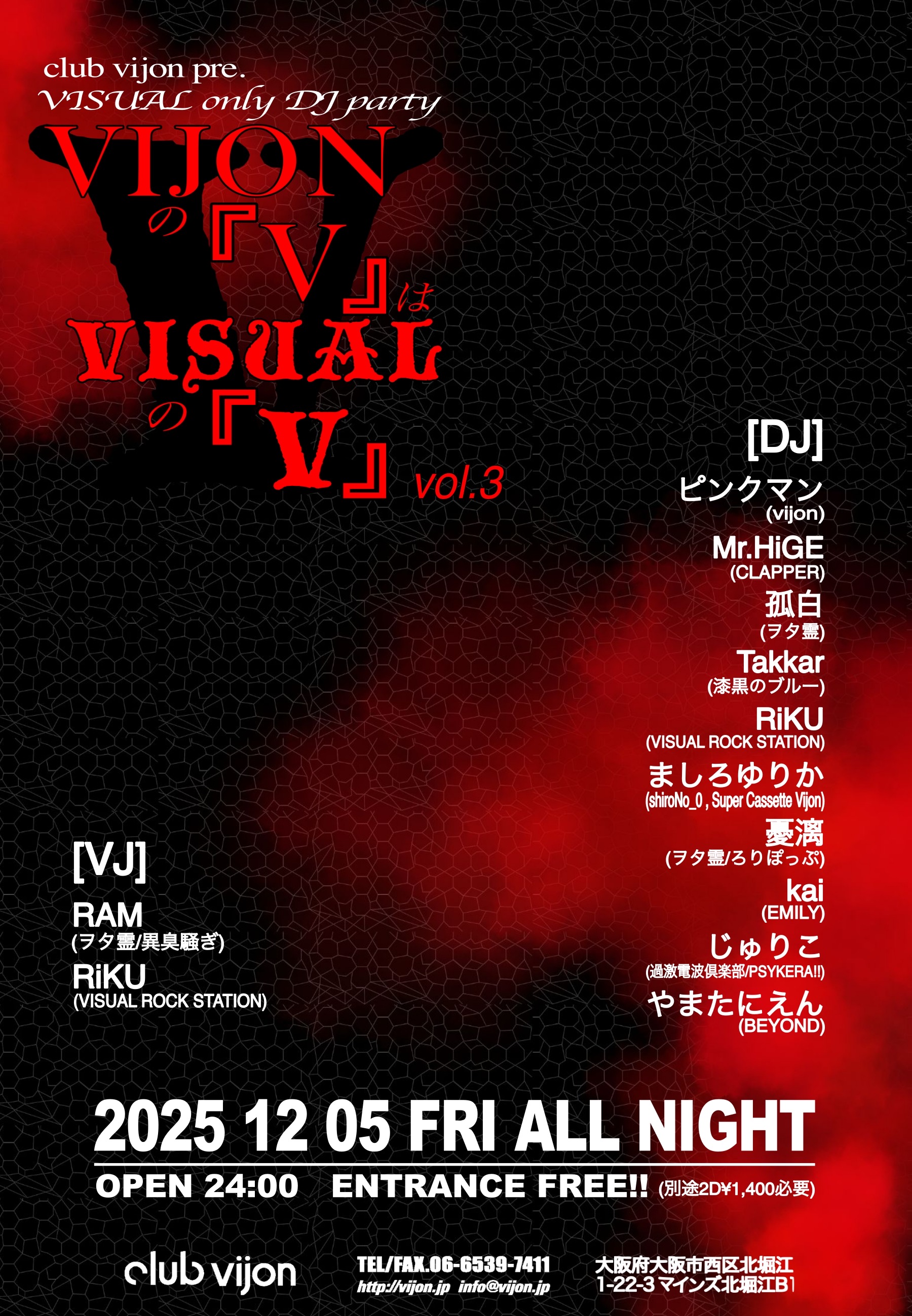 - [DJ] ピンクマン(viojn) / Mr.HiGE(CLAPPER) / 孤白(ヲタ霊) / Takkar(漆黒のブルー) / RiKU(VISUAL ROCK STATION) / ましろゆりか(shiroNo_0 , Super Cassette Vijon) / 憂漓(ヲタ霊/ろりぽっぷ) / kai(EMILY) / じゅりこ(過激電波倶楽部/PSYKERA!!) / やまたにえん(BEYOND) [VJ] RAM(ヲタ霊/異臭騒ぎ) / RiKU(VISUAL ROCK STATION)
