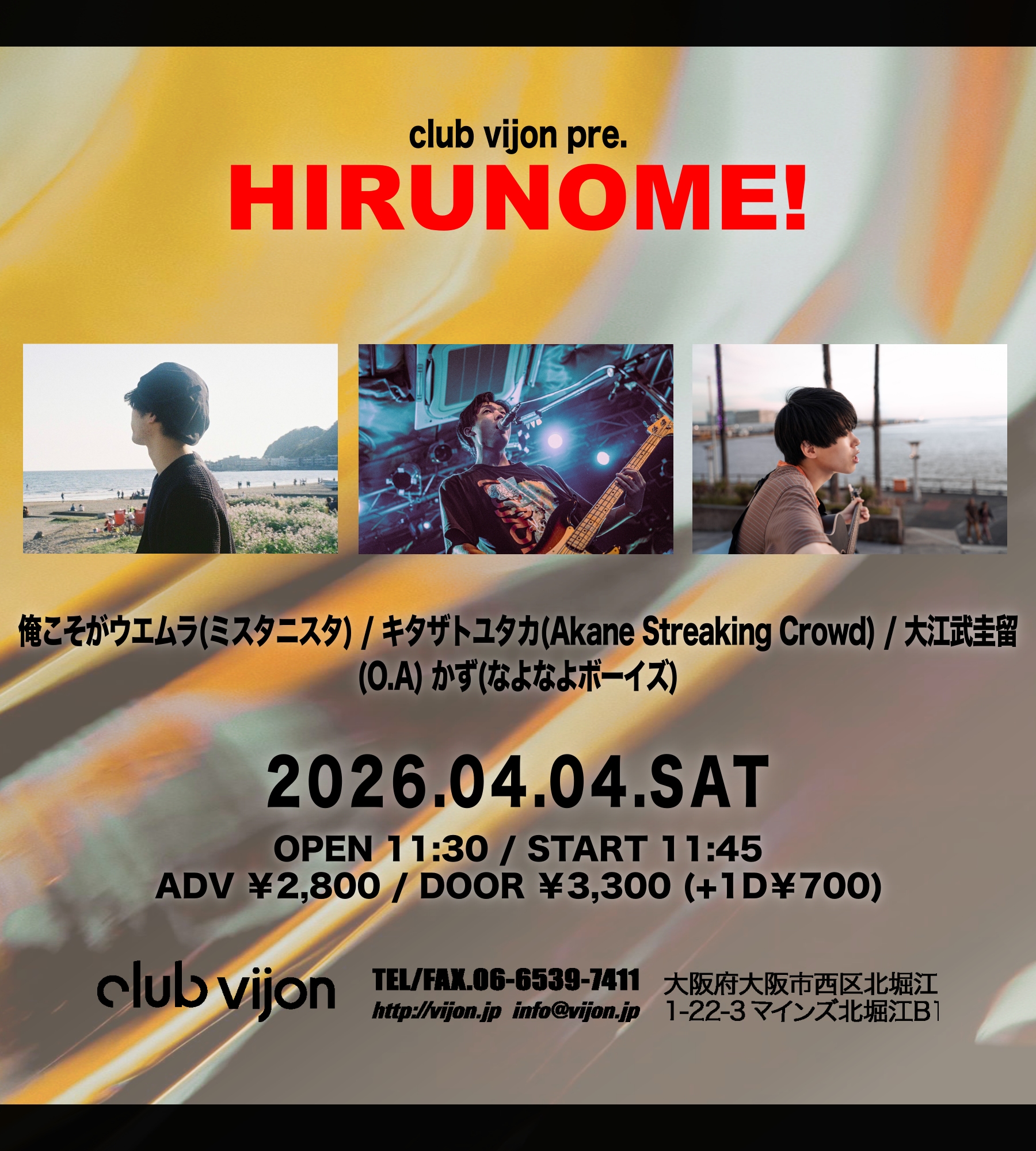 北堀江 club vijon(クラブビジョン) スケジュール 2026.4.04(Sat) club vijon pre.【HIRUNOME!】 [ACT] 俺こそがウエムラ(ミスタニスタ) / キタザトユタカ(Akane Streaking Crowd) / 大江武圭留 / (O.A) かず(なよなよボーイズ) [OPEN/START] 11:30 / 11:45 [料金] ADV¥2,800 DOOR¥3,300 別途1drink¥700 会場販売: (問)北堀江club vijon 06-6539-7411 info@vijon.jp 〒550-0014 大阪府大阪市西区北堀江1-22 マインズ北堀江B1