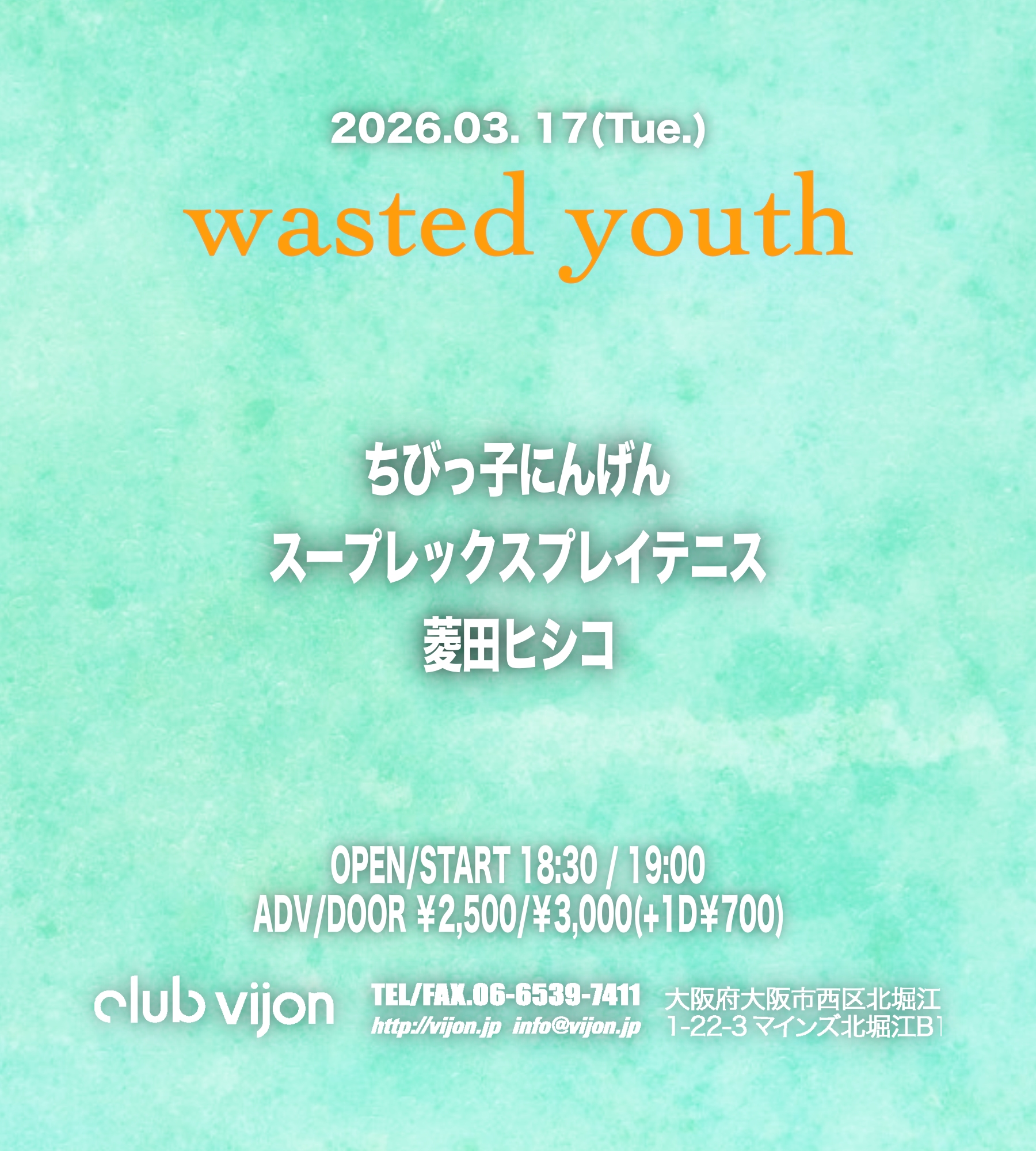 北堀江 club vijon(クラブビジョン) スケジュール 2026.3.17(Tue) 【wasted youth】 [ACT] ちびっ子にんげん / スープレックスプレイテニス / 菱田ヒシコ [OPEN/START] 18:30 / 19:00 [料金] ADV/DOOR ¥2,500/¥3,000 別途Drink代¥700 (問)北堀江club vijon 06-6539-7411 info@vijon.jp 〒550-0014 大阪府大阪市西区北堀江1-22 マインズ北堀江B1
