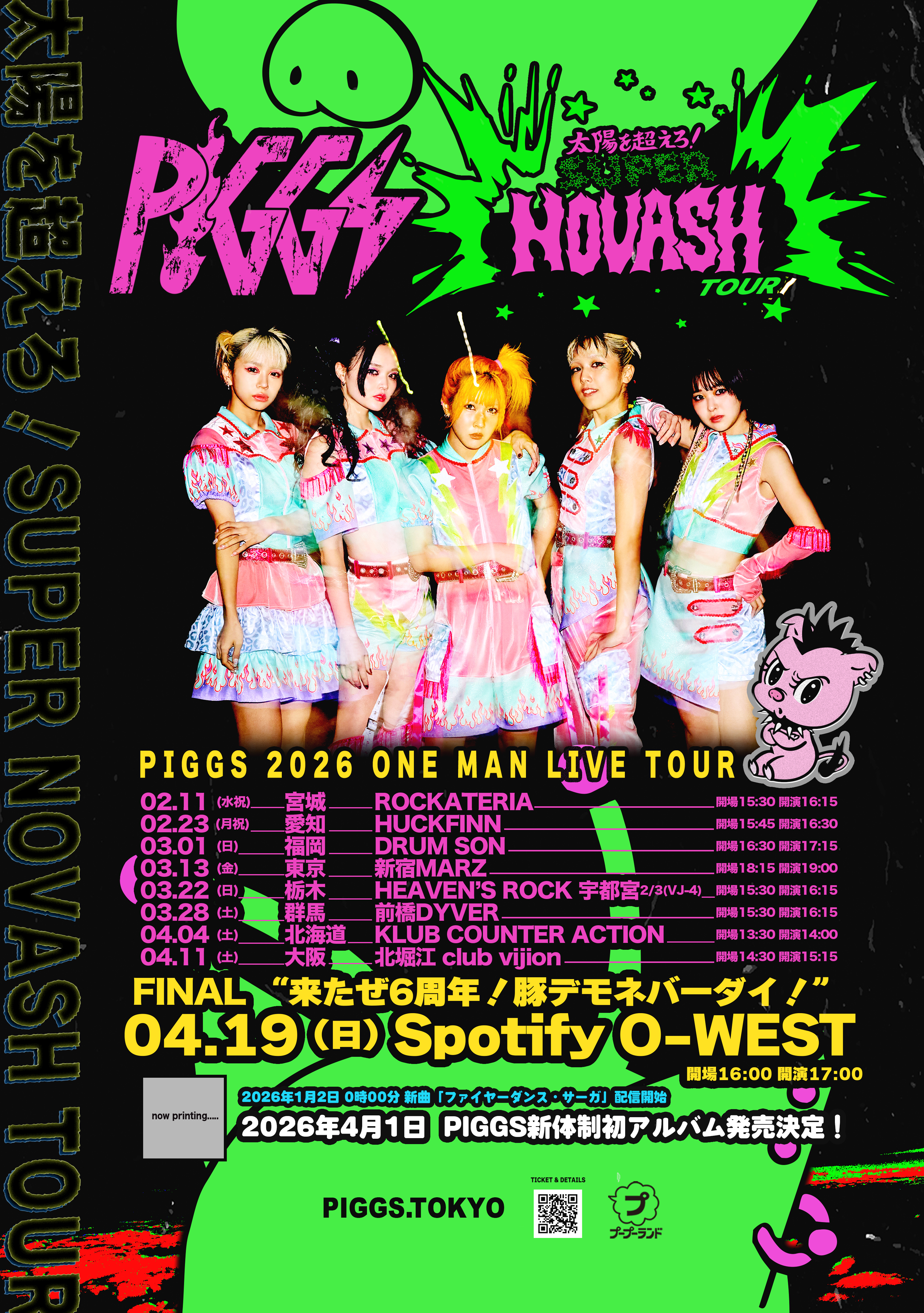 北堀江 club vijon(クラブビジョン) スケジュール 2026.4.11(Sat) 『太陽を超えろ!SUPER NOVASH TOUR』 [ACT] PIGGS [OPEN/START] 14:30/15:15 [料金] サンキュー肉チケット¥3,929 / 当日¥4,500(別途Drink代¥700) 会場販売: (問)北堀江club vijon 06-6539-7411 info@vijon.jp 〒550-0014 大阪府大阪市西区北堀江1-22 マインズ北堀江B1