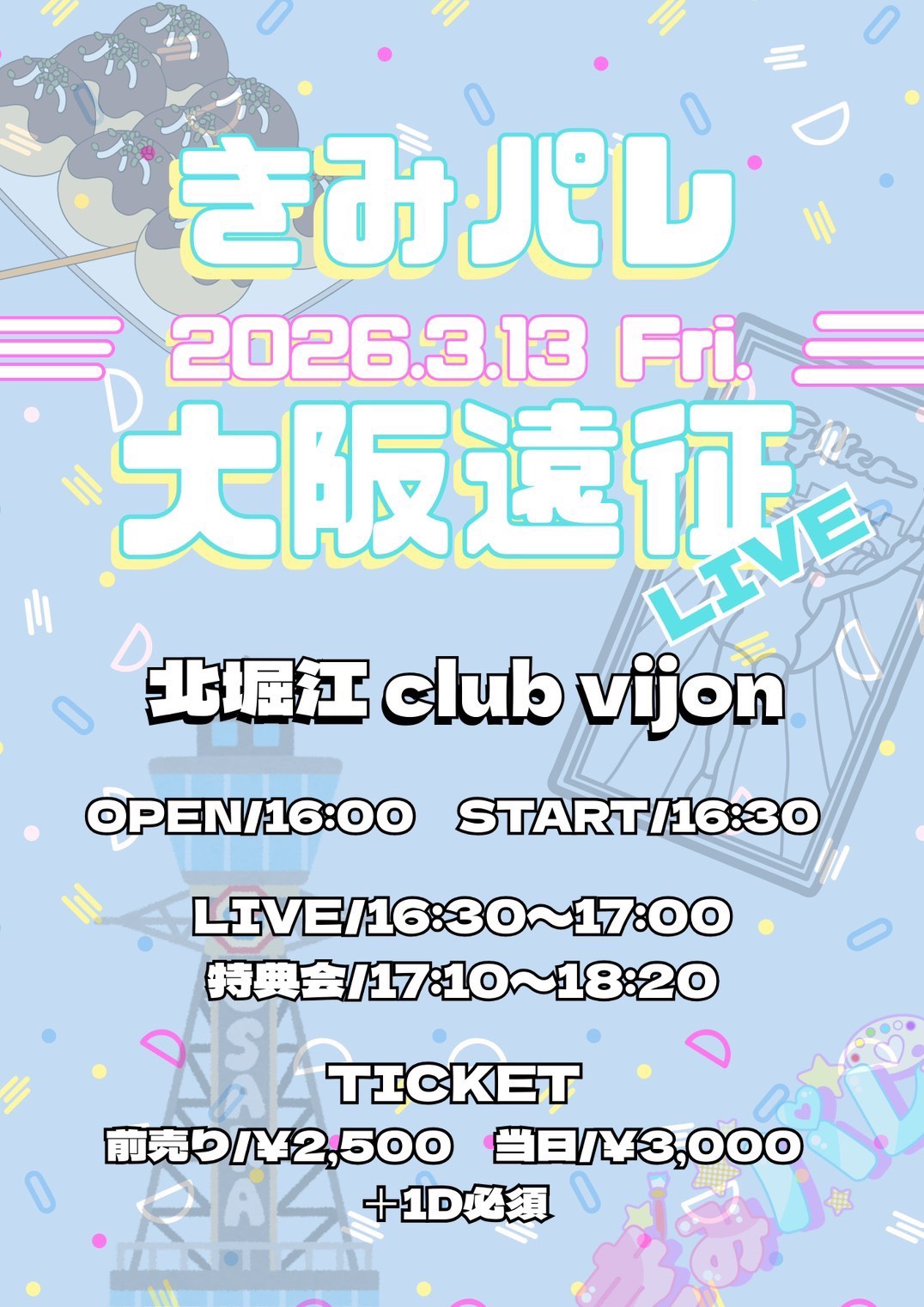 北堀江 club vijon(クラブビジョン) スケジュール 2026.3.13(Fri) きみパレ 大阪遠征LIVE [ACT] きみパレ [OPEN/START] 16:00/16:30 [料金] ADV/DOOR ¥2,000/¥2,500 別途Drink代¥700 会場販売: (問)北堀江club vijon 06-6539-7411 info@vijon.jp 〒550-0014 大阪府大阪市西区北堀江1-22 マインズ北堀江B1 主催/制作:株式会社FLAP entertainment