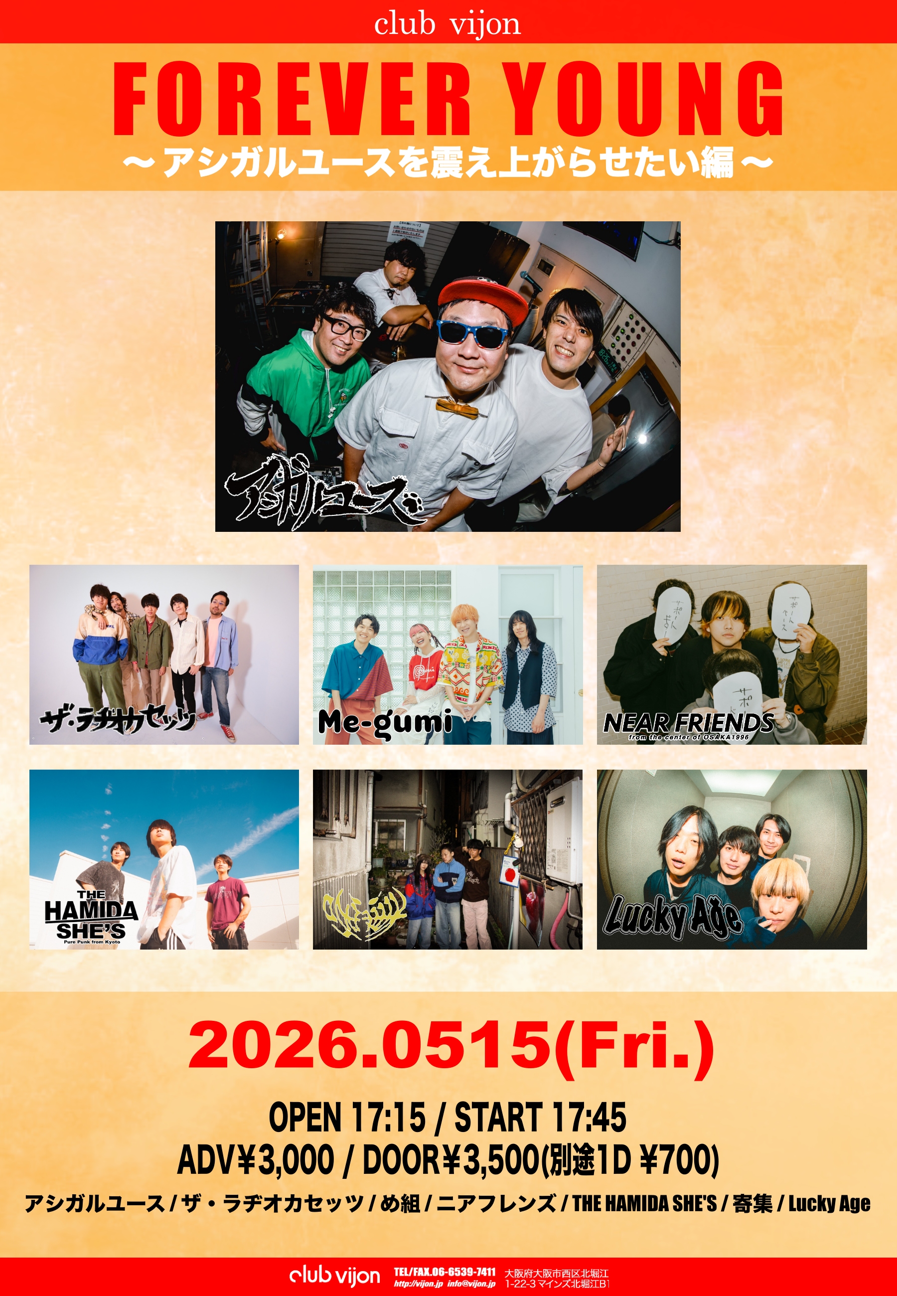 北堀江 club vijon(クラブビジョン) スケジュール 2026.5.15(Fri) 【FOREVER YOUNG】 〜 アシガルユースを震え上がらせたい編 〜 [ACT] アシガルユース / ザ・ラヂオカセッツ / め組 / ニアフレンズ / THE HAMIDA SHE'S / 寄集 / Lucky Age [OPEN/START] 17:15 / 17:45 [料金] ADV/DOOR ¥3,000 / ¥3,500 別途Drink代¥700 (問)北堀江club vijon 06-6539-7411 info@vijon.jp 〒550-0014 大阪府大阪市西区北堀江1-22 マインズ北堀江B1