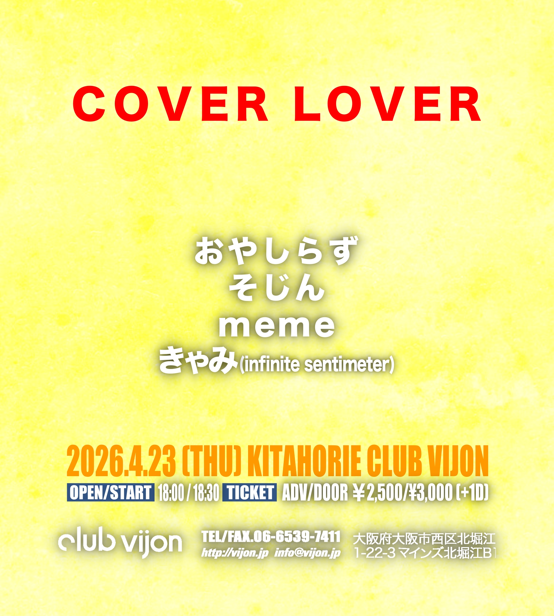 北堀江 club vijon(クラブビジョン) スケジュール 2026.4.23(Thu) 【COVER LOVER】 [ACT] おやしらず / そじん / meme / きゃみ(infinite sentimeter) [OPEN/START] 18:00 / 18:30 [料金] ADV/DOOR ¥2,500 / ¥3,000 別途Drink代¥700 会場販売: (問)北堀江club vijon 06-6539-7411 info@vijon.jp 〒550-0014 大阪府大阪市西区北堀江1-22 マインズ北堀江B1